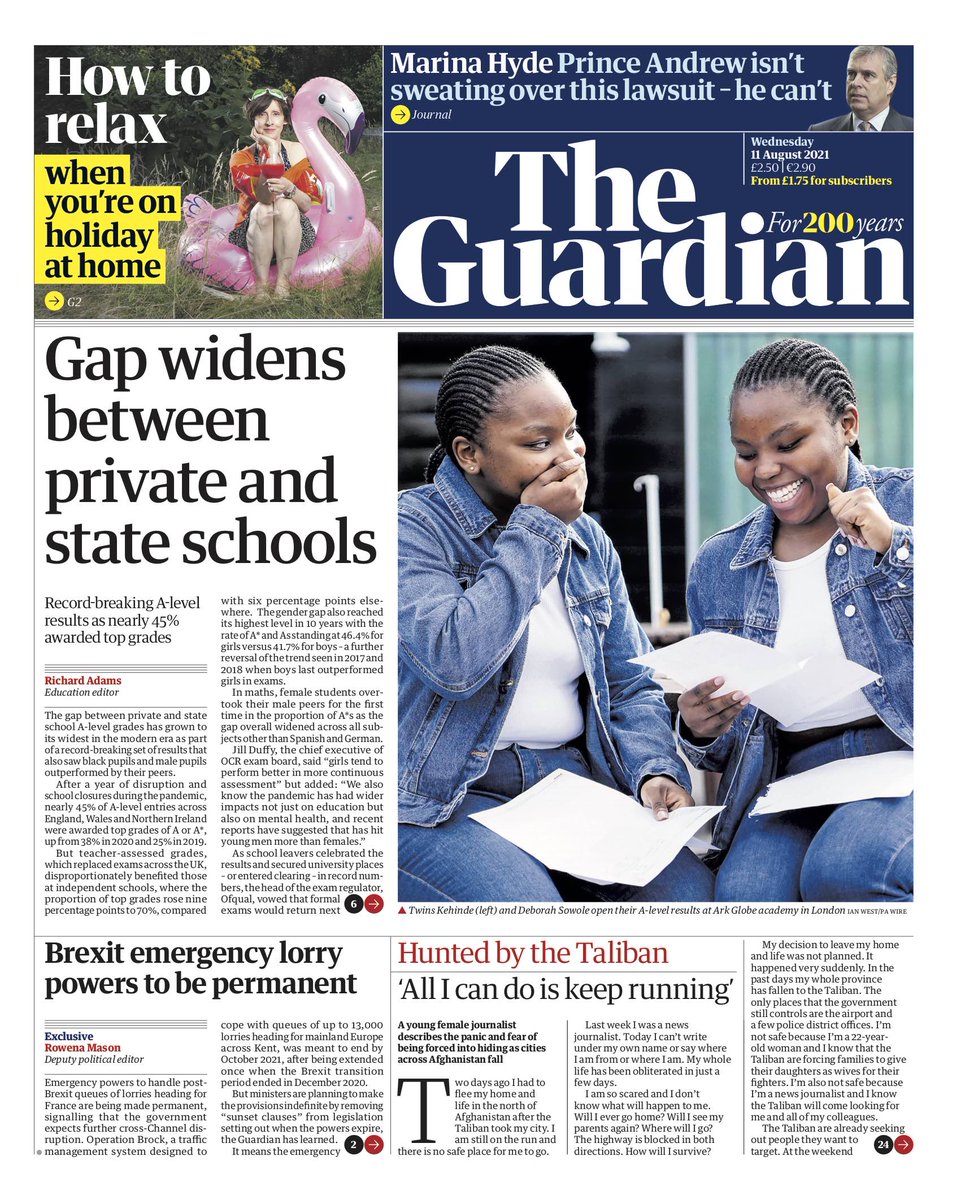 The gap between private and state school A-level grades has grown to its widest in the modern era, The Guardian reports.