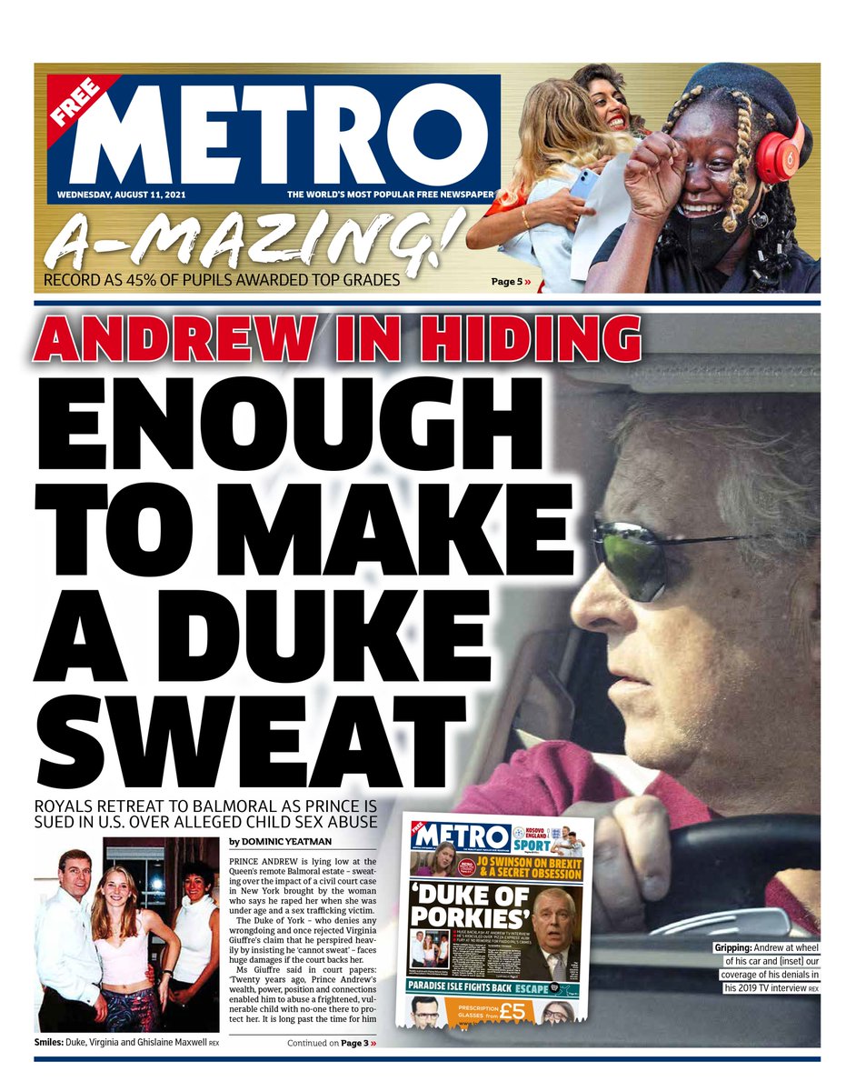 Prince Andrew is “lying low” at the Queen’s Balmoral estate after a lawsuit was filed in the US accusing him of sexually abusing Virginia Giuffre when she was 17, the Metro reports on its front page.