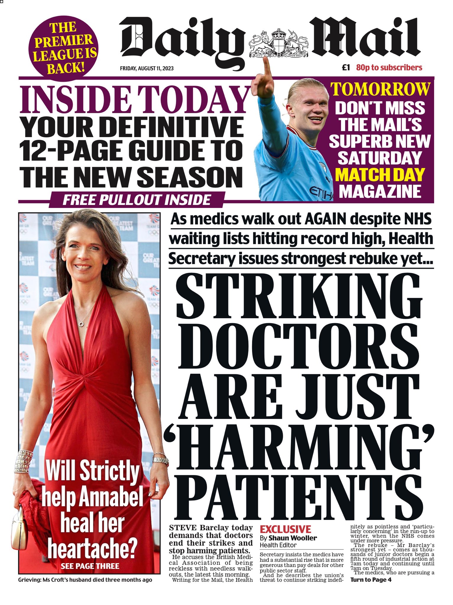 The Daily Mail accuses striking NHS doctors of harming patients as waiting lists reach an all-time high.