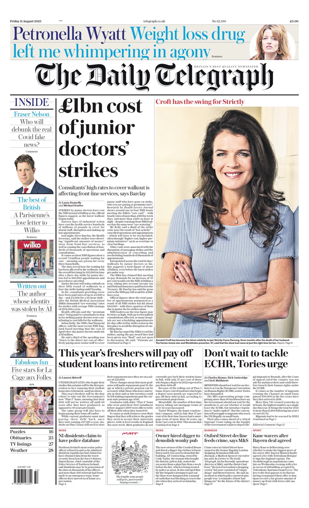 The Daily Telegraph highlights that the recent junior doctors strike has resulted in costs of £1bn following the latest walkout.