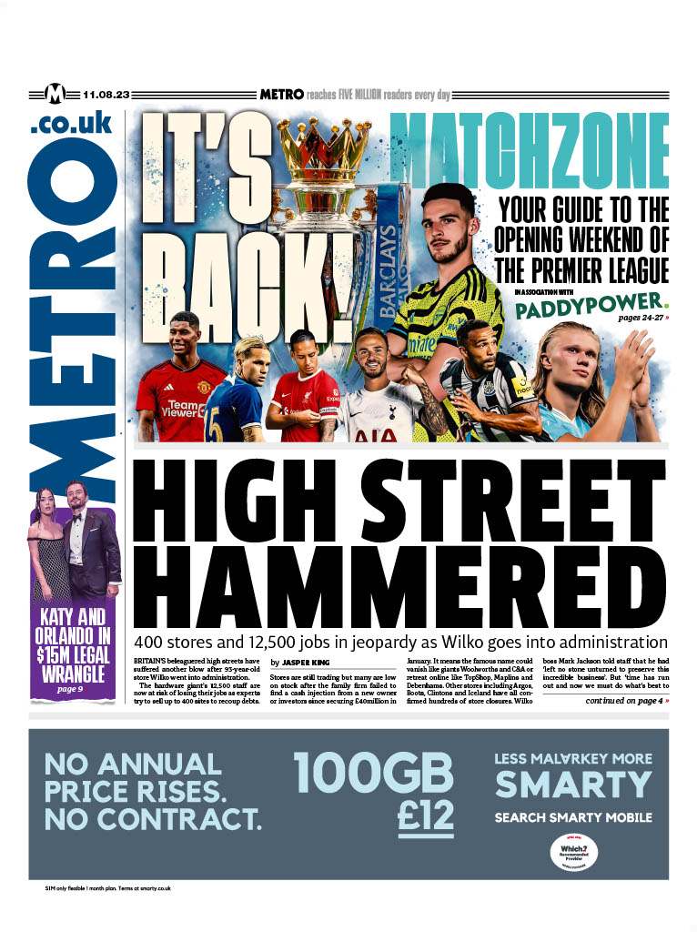 The Metro reports that retail chain Wilko is entering administration, potentially threatening 12,500 jobs.