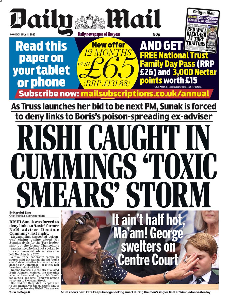 The Daily Mail reports that Rishi Sunak denied links to Dominic Cummings after posting “poisonous” comments online about his rivals for the Tory leadership.
