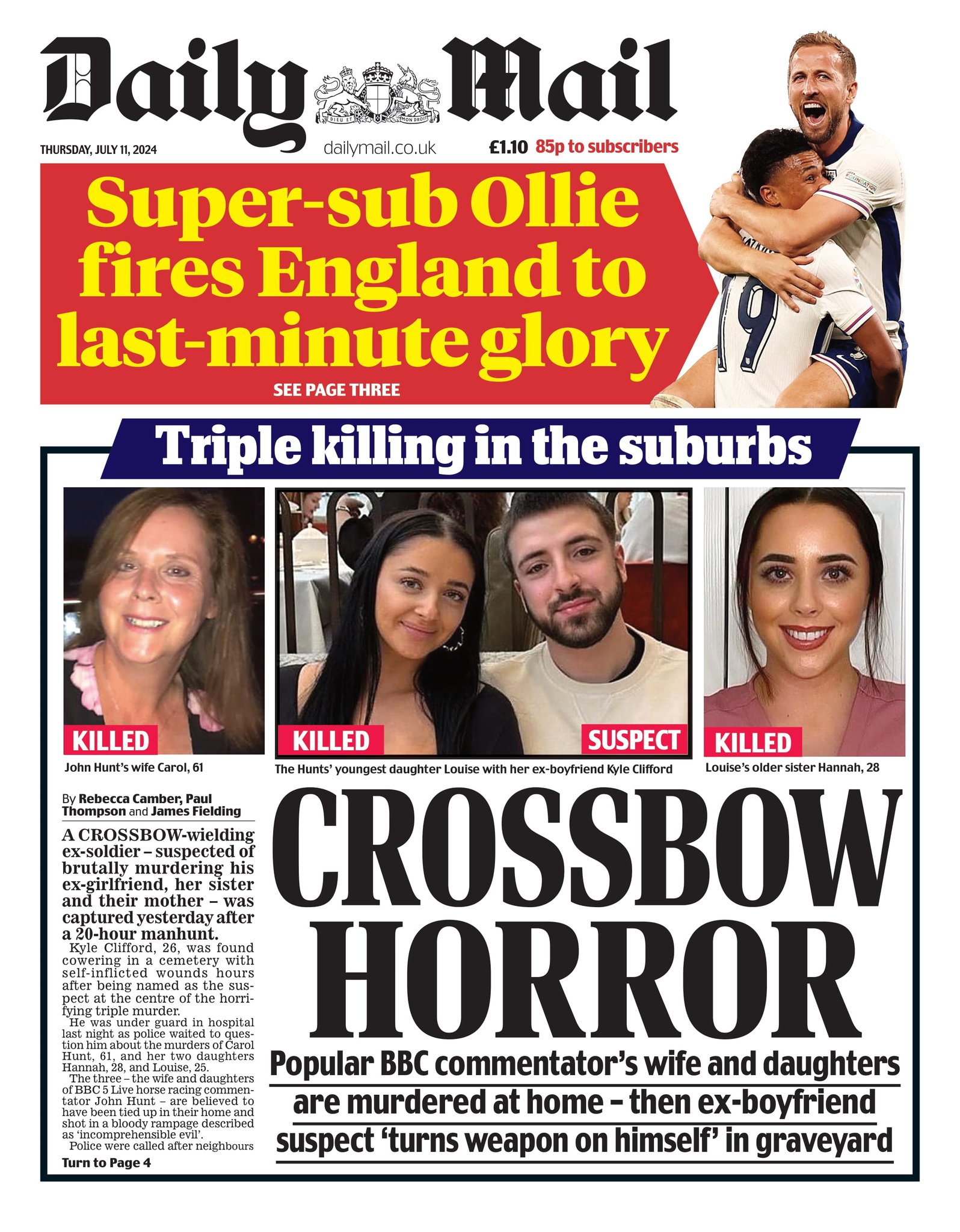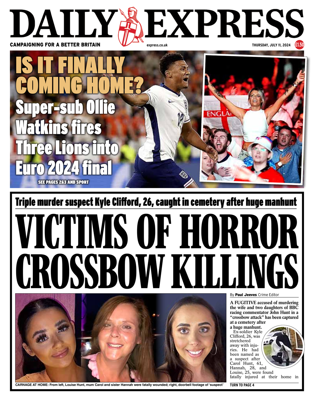 The Daily Express reports that Kyle Clifford, the suspect in the crossbow attack that killed three women in Bushey, Hertfordshire, was apprehended in a north London cemetery.