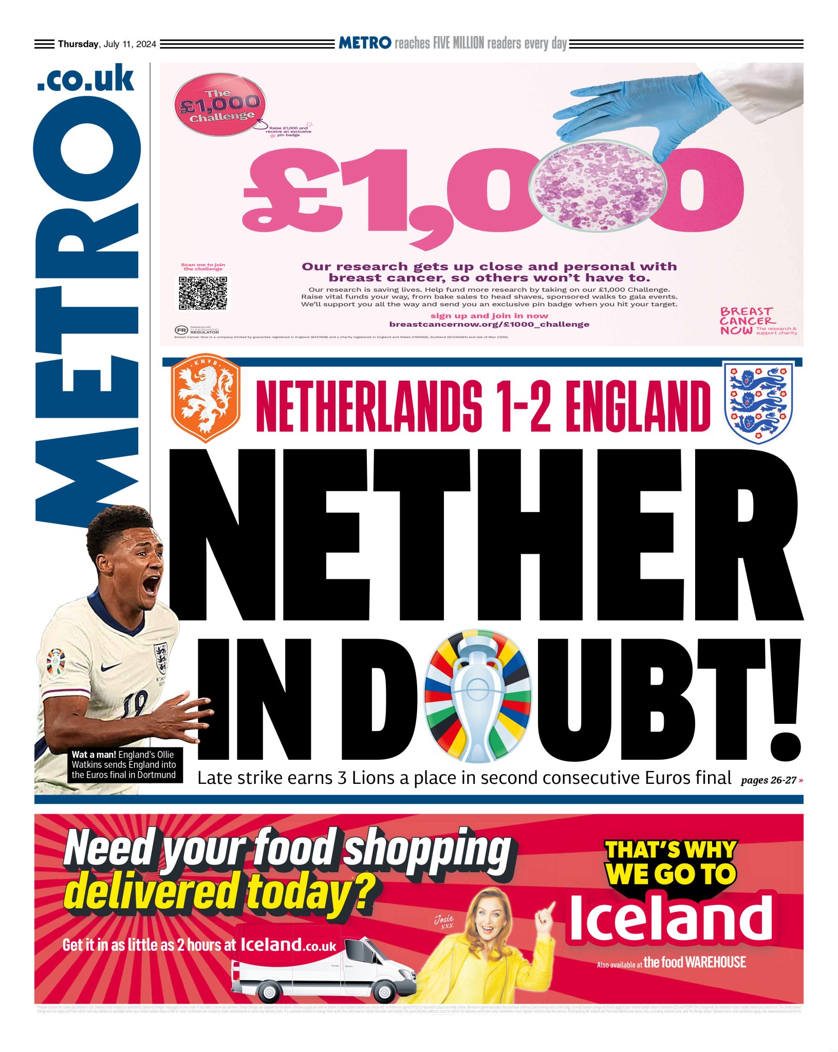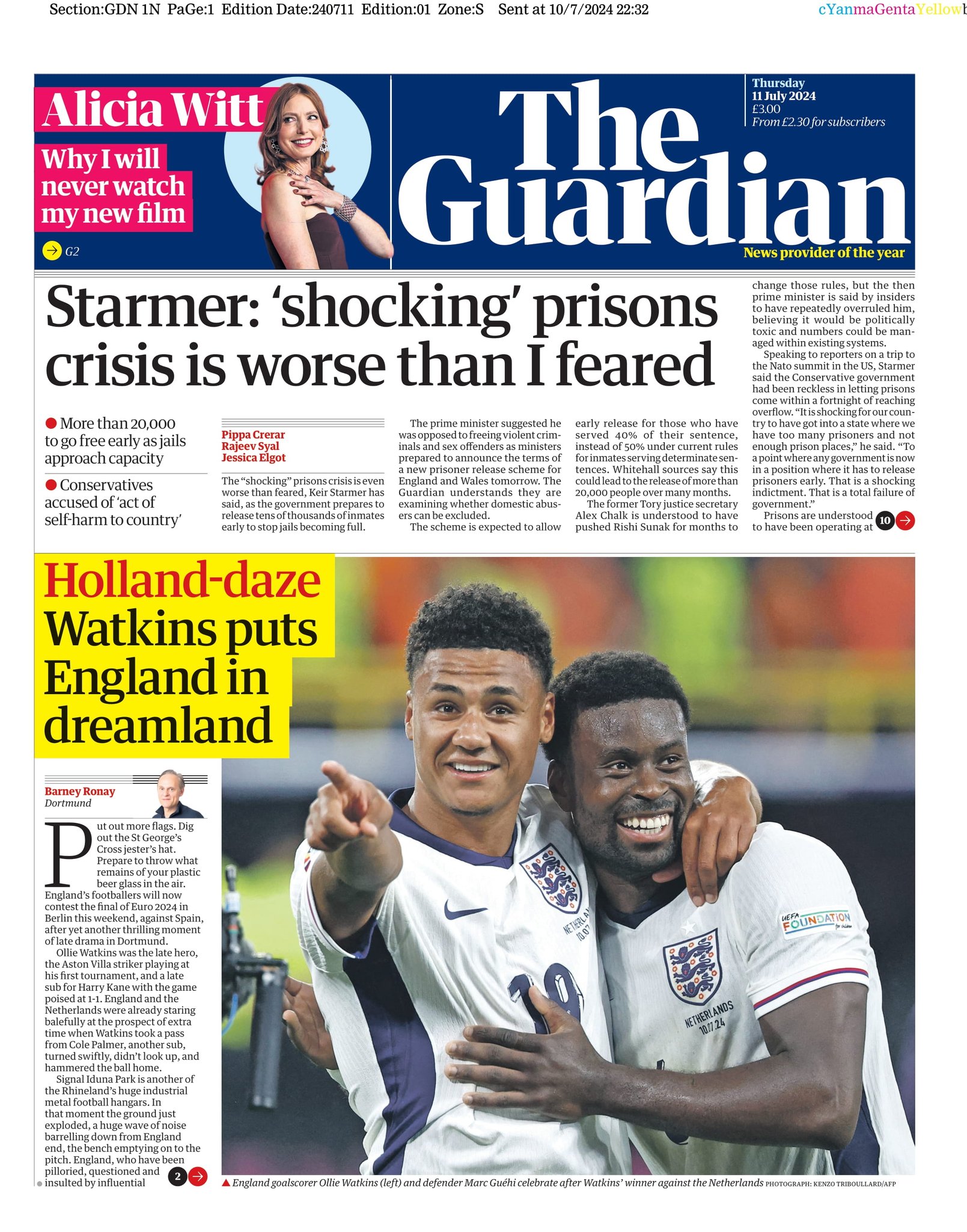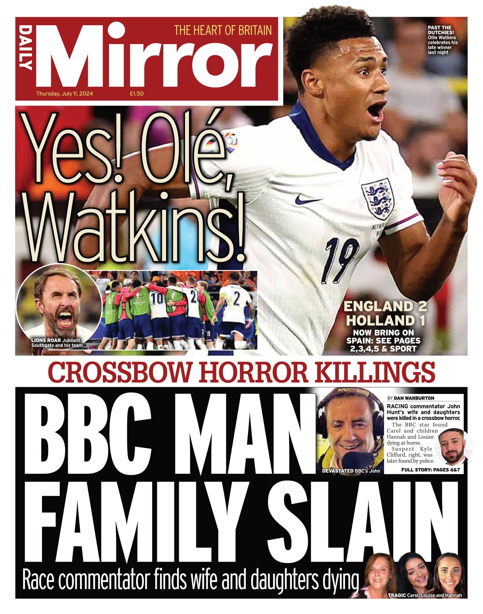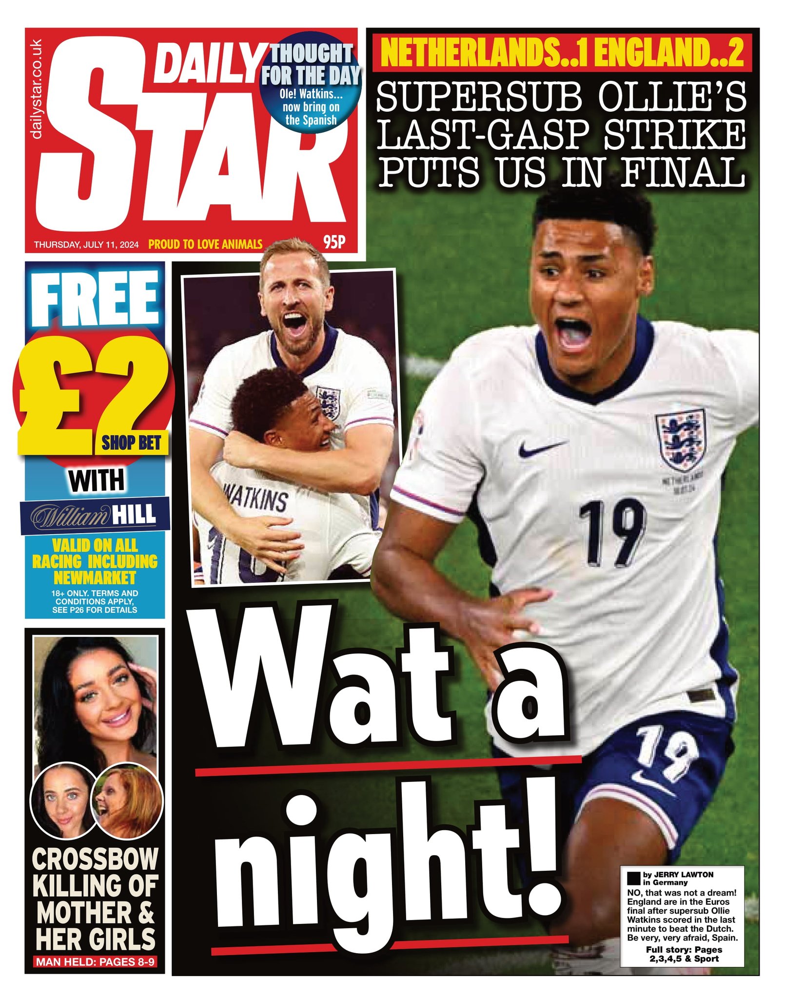 Daily Star: Ollie Watkins’ last-minute goal propels England to the Euro 2024 final, prompting the headline “What a night!”.