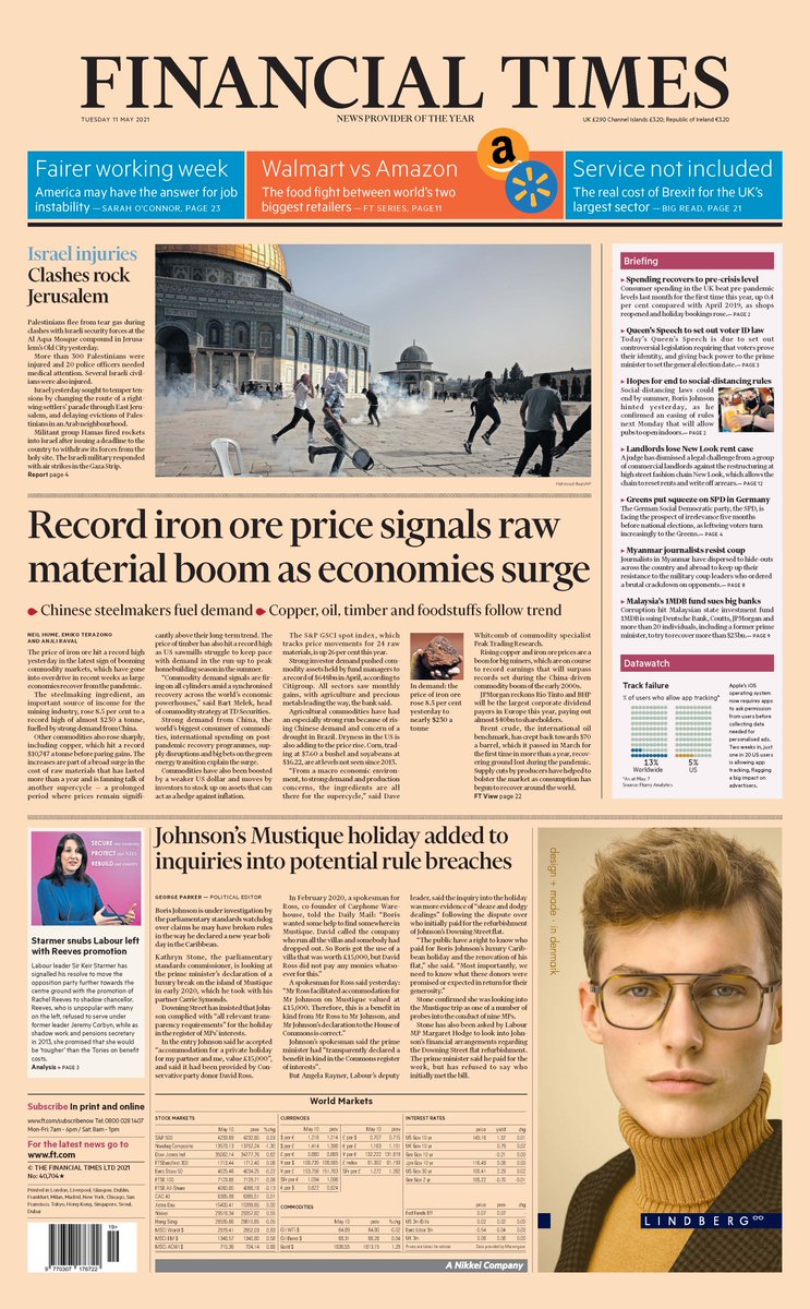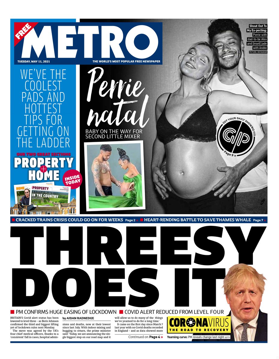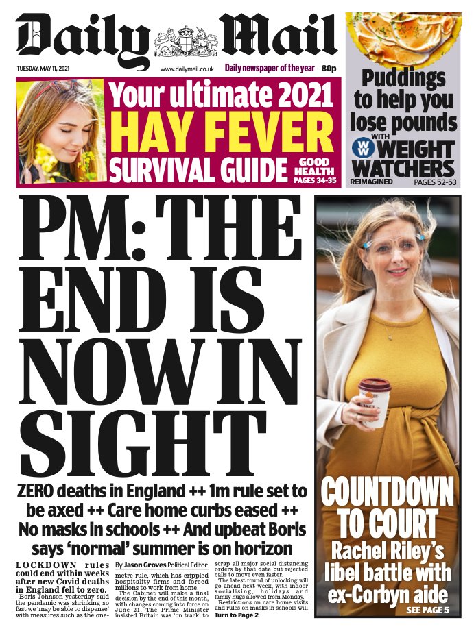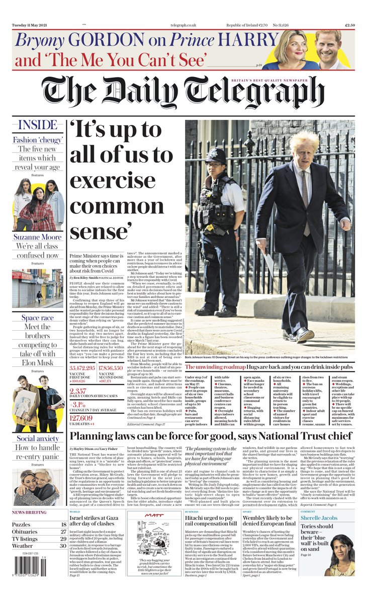 The Times, like most of the papers, leads with Boris Johnson’s confirmation of a major easing of coronavirus restrictions next Monday.It says hugs will be allowed for the first time in more than a year, pubs and restaurants can serve inside, cinemas and theatres can reopen, and five people will be able to visit care home residents.However, it adds that the PM has urged people not to “throw caution to the wind”.