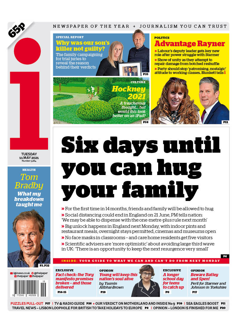 The i says it’s six days until people can hug their family members again.It also highlights other things that will be permitted again as COVID rules ease, such as “indoor pints” and the opening of cinemas and museums.