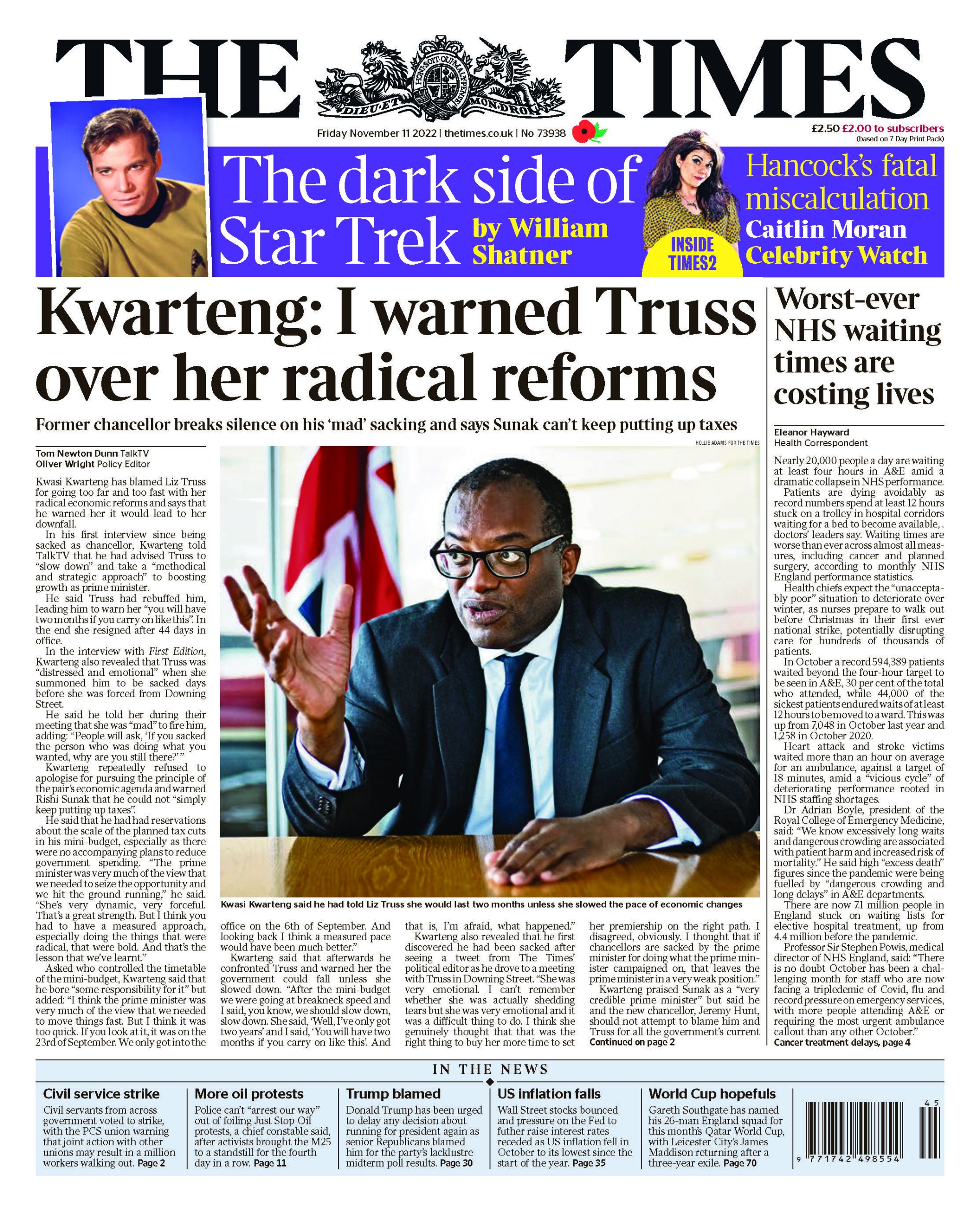 In The Times, Kwasi Kwarteng says he warned Liz Truss against radical reforms that ultimately led to her resignation.