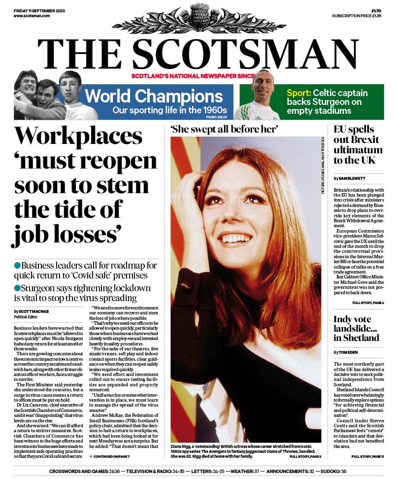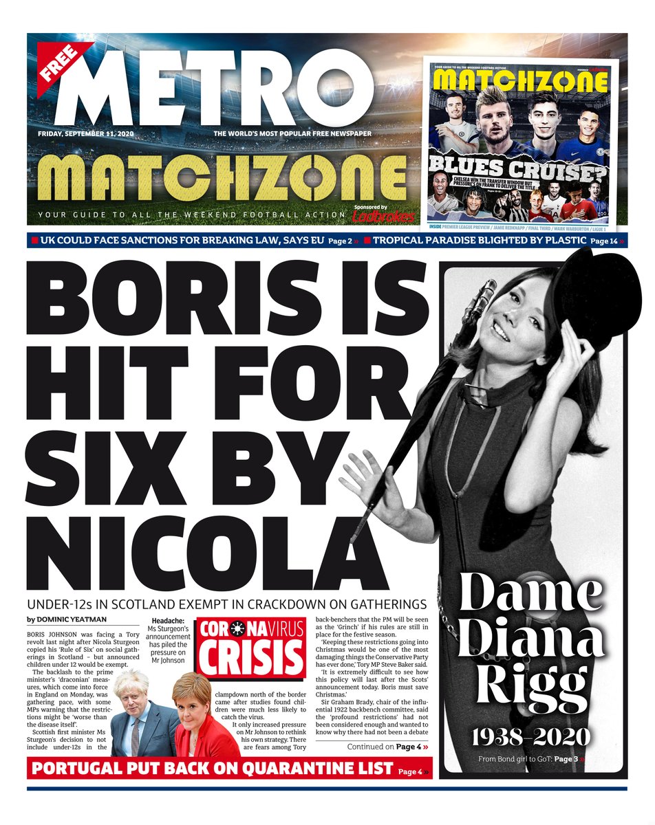 The Metro says that Prime Minister Boris Johnson is facing a revolt by his own party, after Scottish First Minister Nicola Sturgeon announced her own version of the “rule of six” – but excluded under 12s.