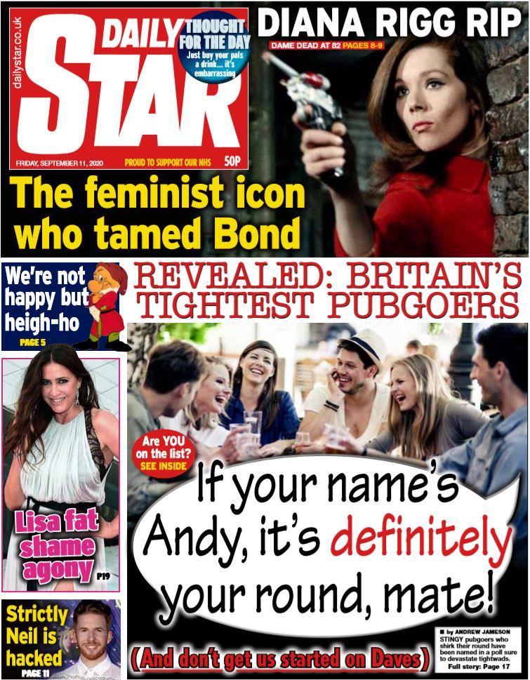 And the Daily Star leads on a “revelatory” poll “sure to devastate tightwads”. It has got its hands on a list of names of “stingy pubgoers” – that is, those who are supposedly most likely to shirk their turn to buy a round in the pub. “Are you on the list? See inside,” the paper teases.