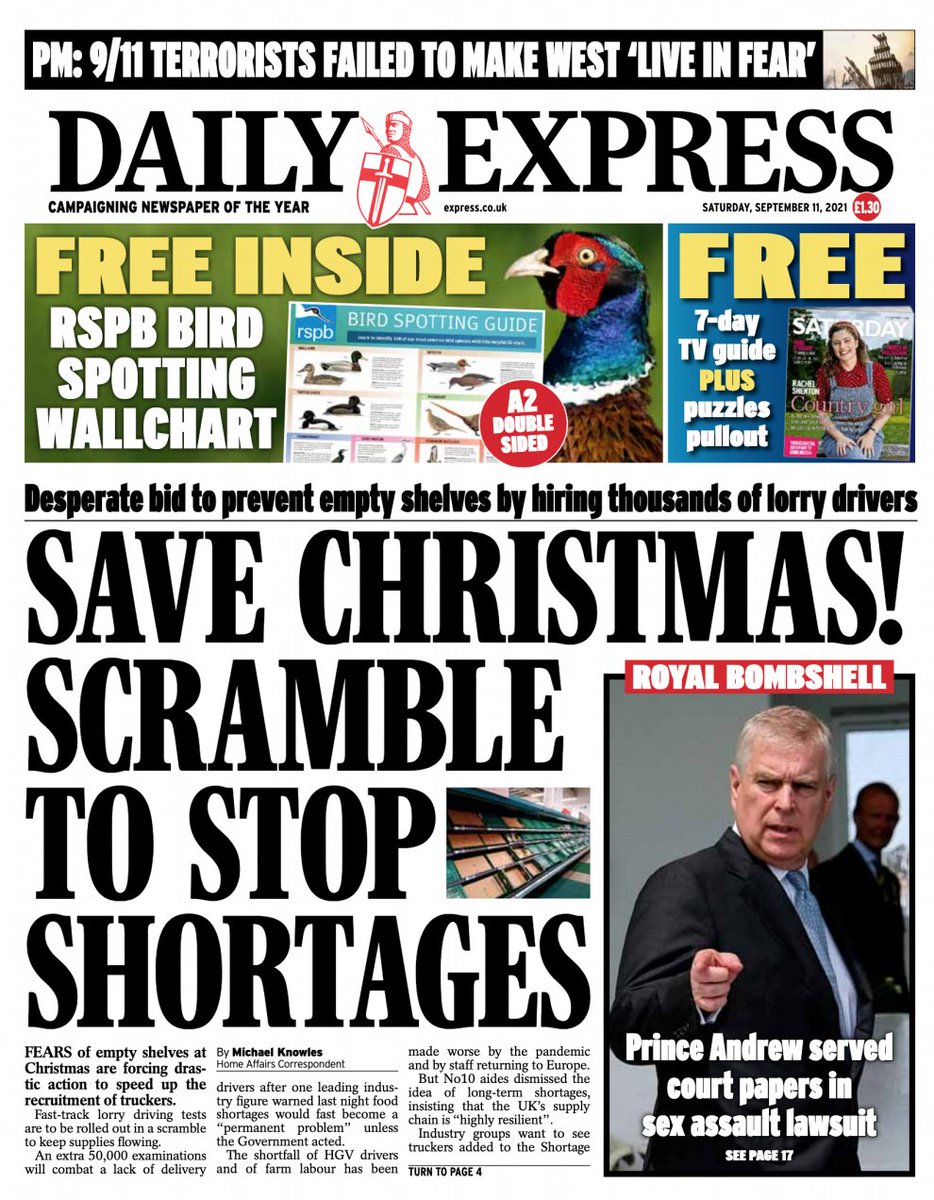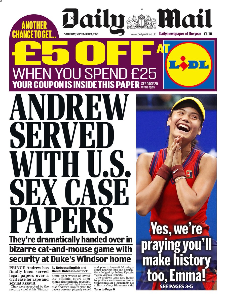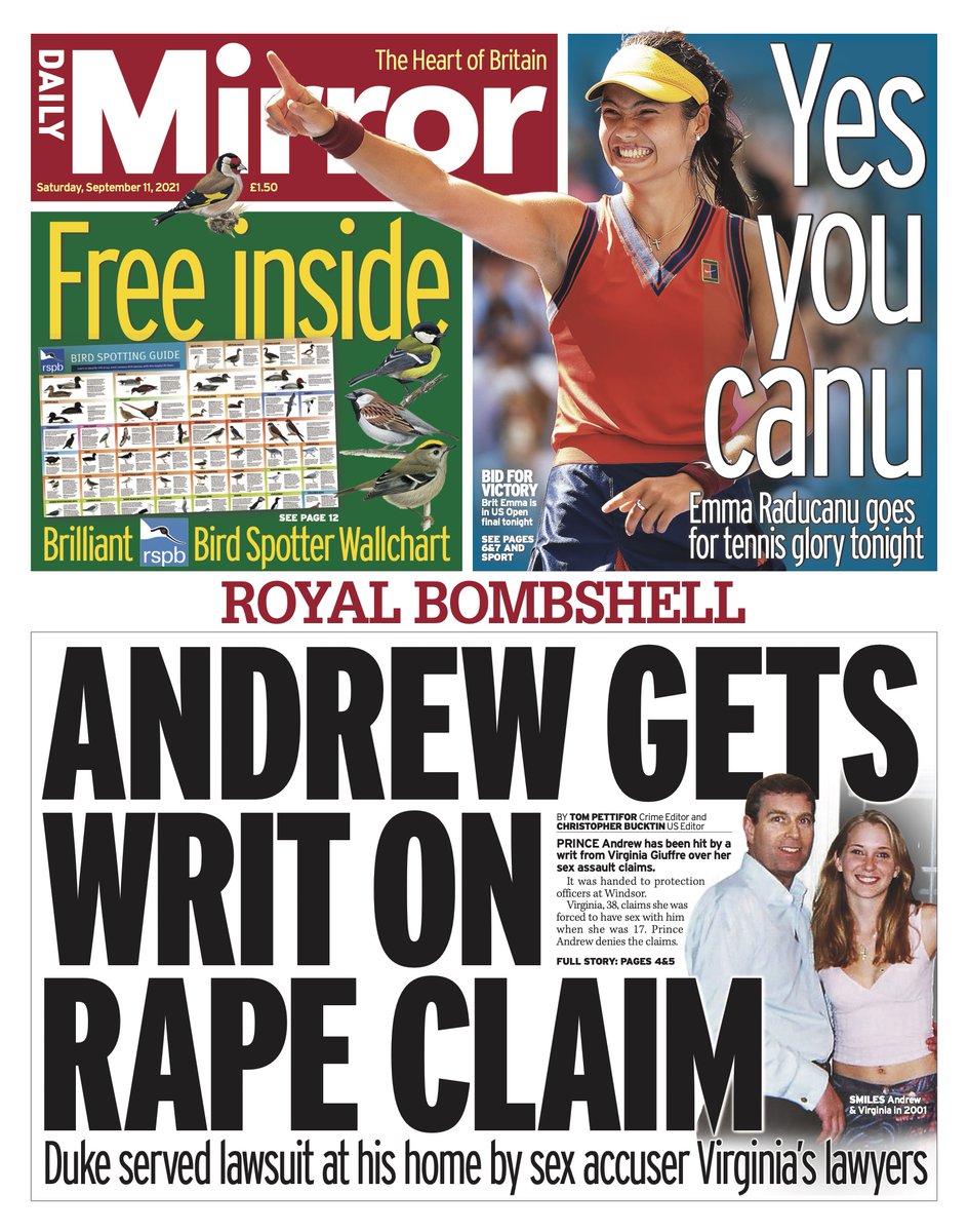 Prince Andrew being served legal papers for sexual assault features on the Daily Mirror frontpage.