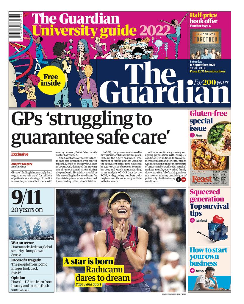 The Guardian says GPs are “struggling to guarantee safe care” for millions of patients due to a shortage of medics, citing Britain’s top family doctor.