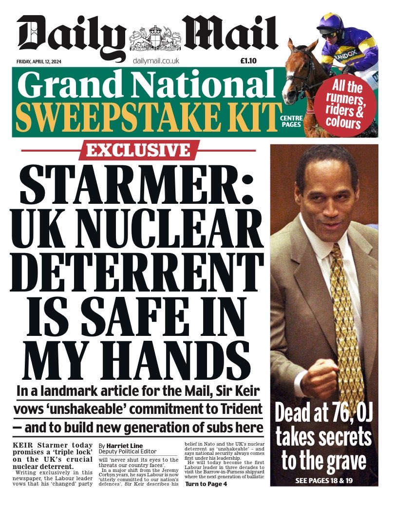 The Daily Mail reports on Sir Keir Starmer’s pledge for a “triple lock” on the UK’s vital nuclear deterrent.