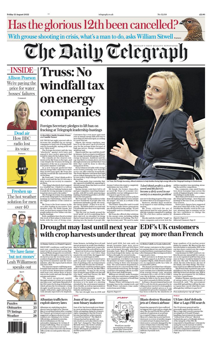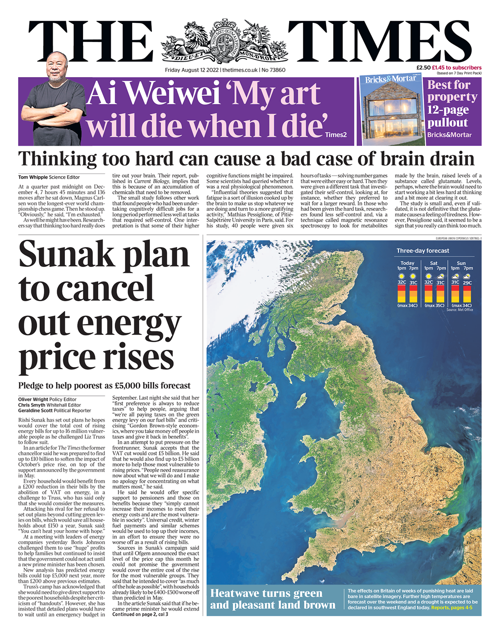 Rishi Sunak’s plan to help people this winter with their energy bills is featured in The Times.