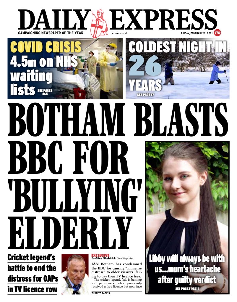 In the Daily Express,Lord Botham’s efforts to help pensioners forced to pay for their TV licence is the lead story.