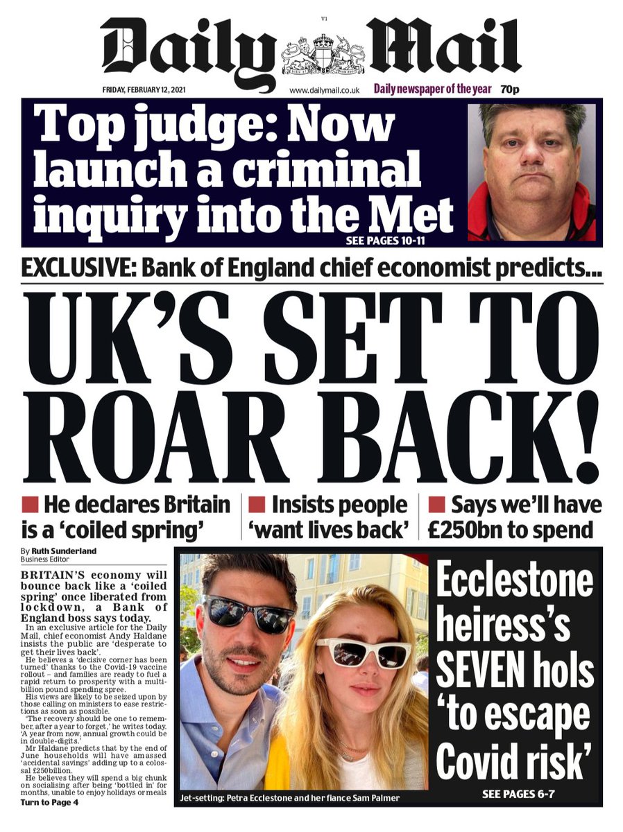 There’s optimism over the UK’s economic future in the Daily Mail, based on comments from the Bank of England’s chief economist.