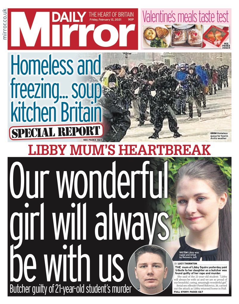 The Daily Mirror reports on comments made by the mother of Libby Squire on the day a serial sex offender was convicted of her murder.