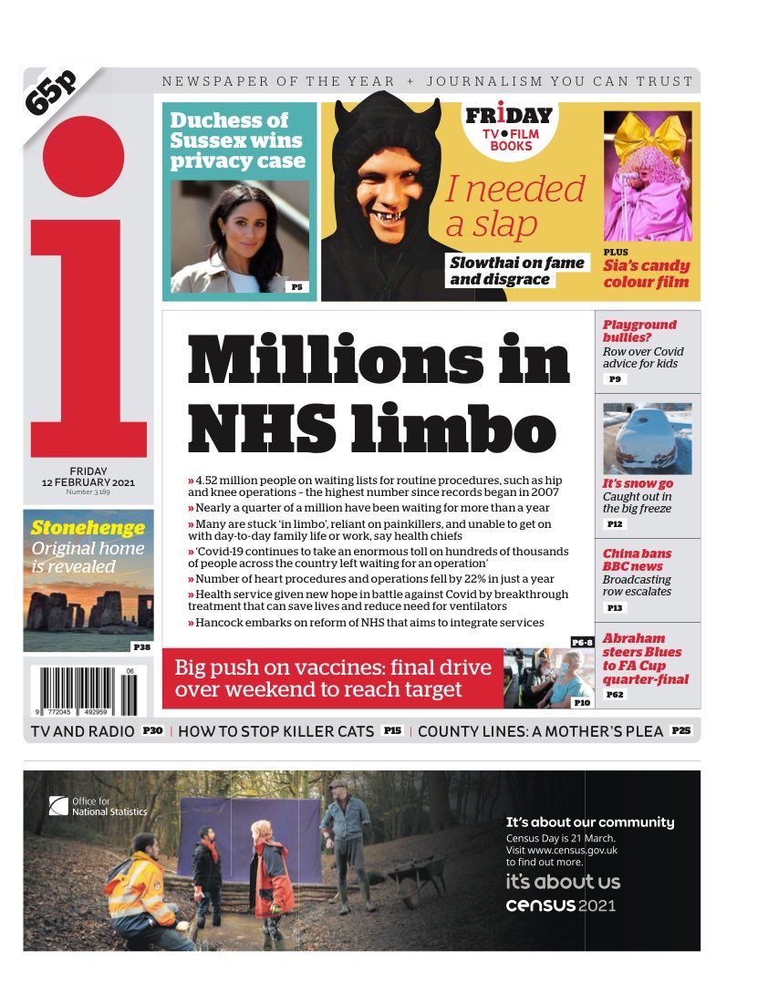 The i reports on the upheaval in the NHS caused by the pandemic, saying millions of patients are waiting for routine procedures.