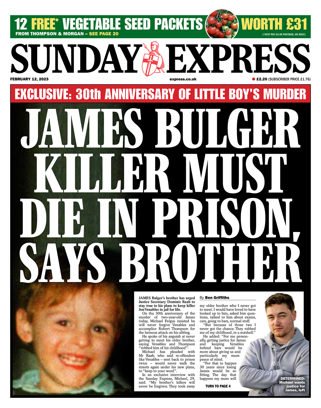 On the front of the Sunday Express, James Bulger’s brother calls for one of the killers, Jon Venables, to remain in jail for the rest of his life.