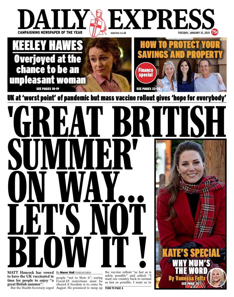 Health Secretary Matt Hancock’s claims that the vaccine means we could still enjoy a “Great British summer”, makes the lead in the Daily Express.
