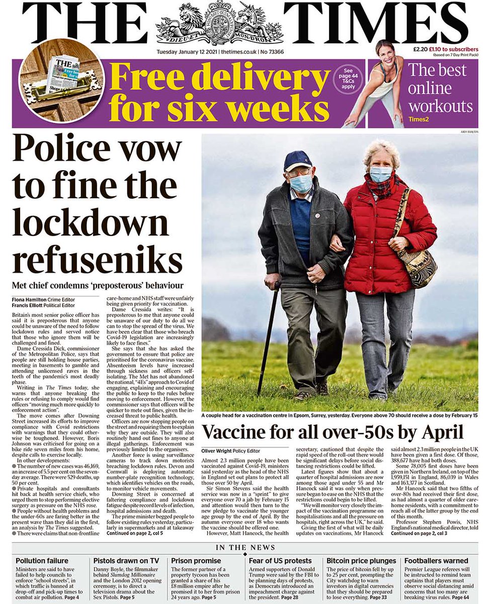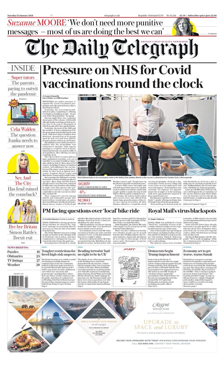 The Daily Telegraph splashes on pressure on the government to offer COVID-19 vaccinations 24 hours a day, with countries like Israel already protecting a fifth of their population by offering around the clock jabs.