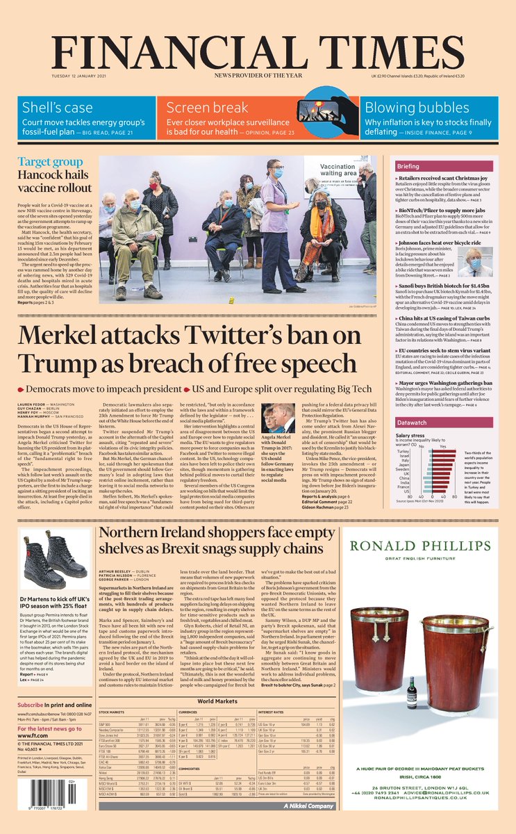 The Financial Times reports on the US House of Representatives moving to impeach President Donald Trump, with German Chancellor Angela Merkel criticising Twitter for banning him from the platform.You can read more from the US here.