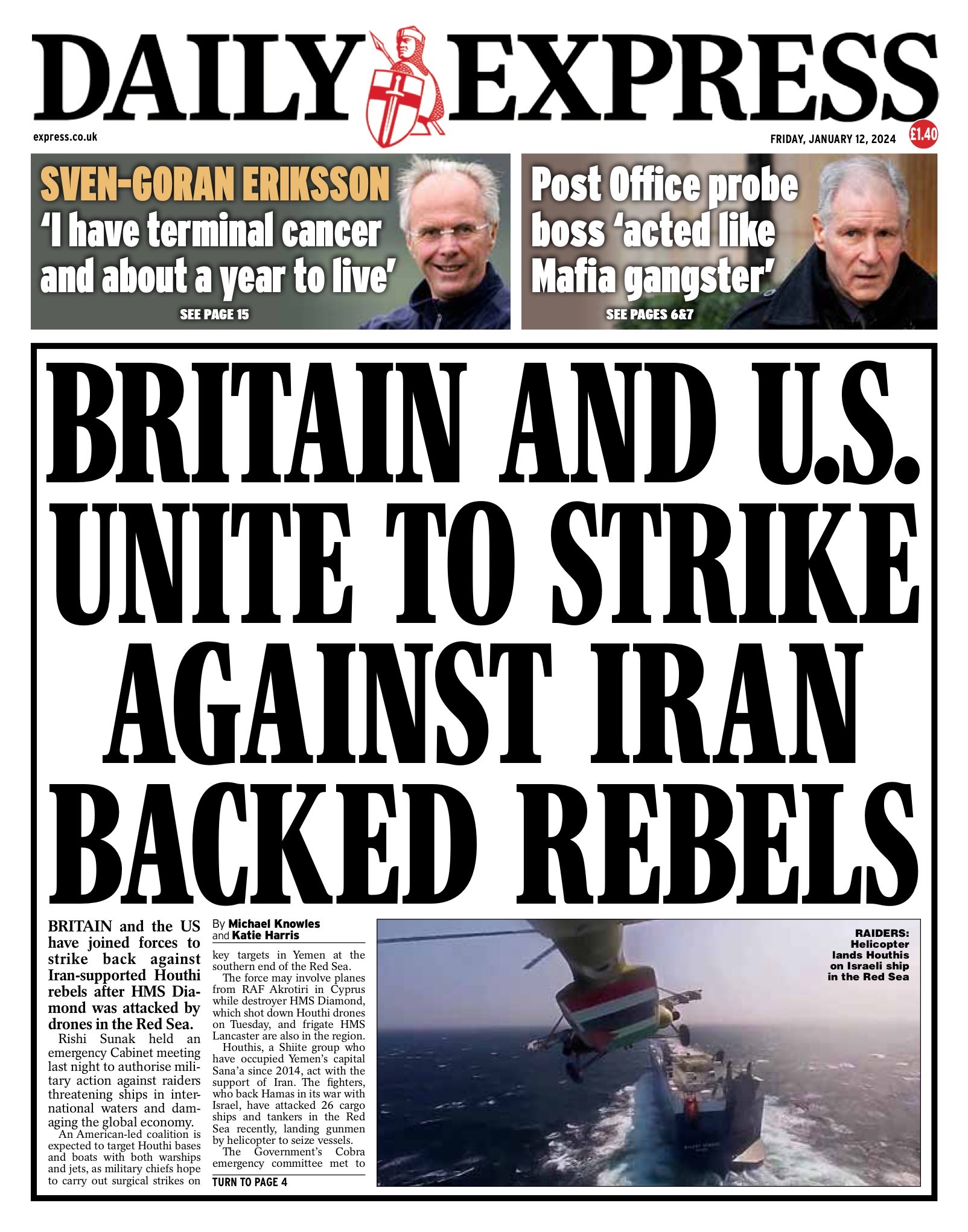 The Daily Express reports on the UK and US uniting to combat Iran-backed Houthi rebels following an urgent Cabinet meeting led by Rishi Sunak.