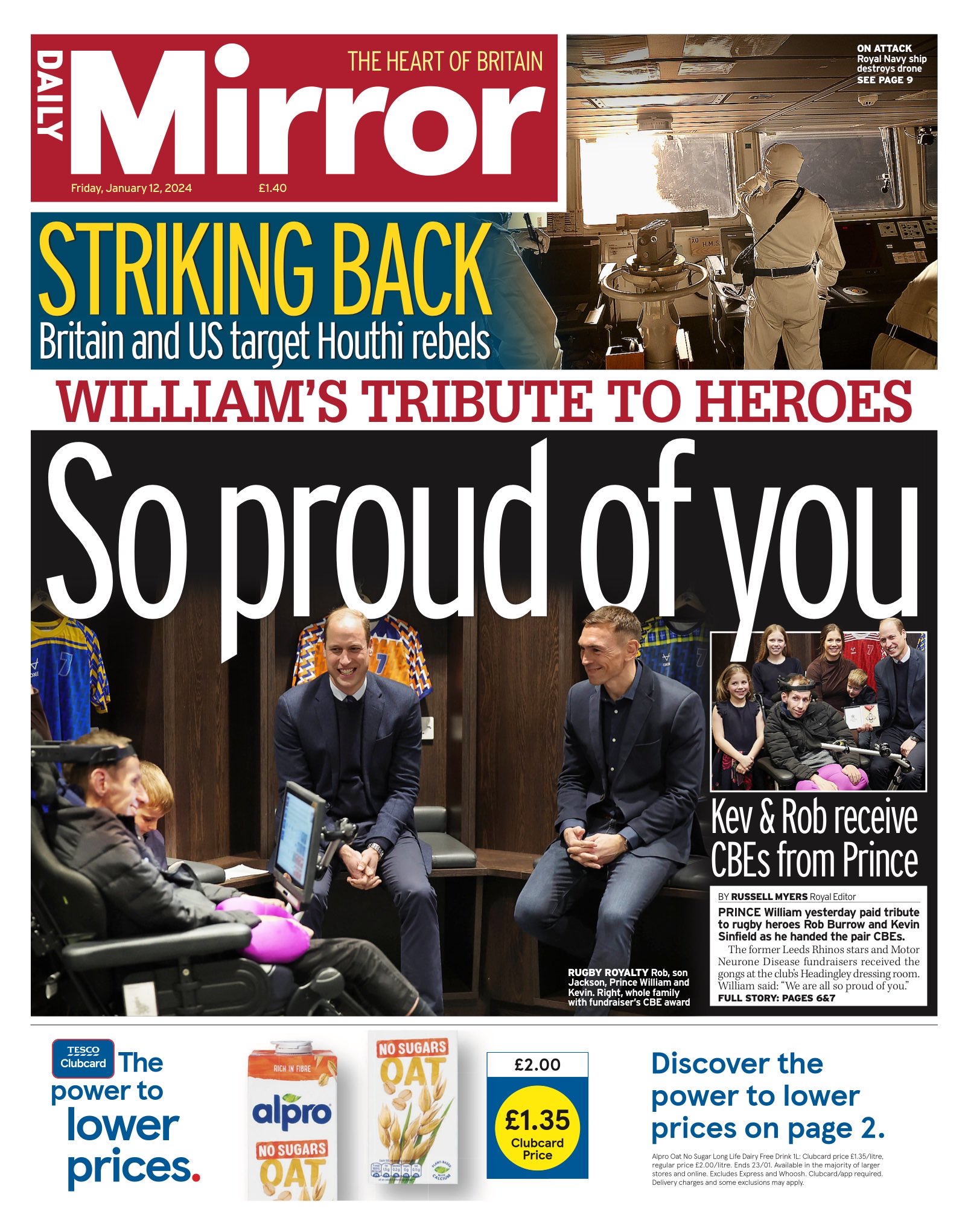 The Daily Mirror reports on Prince William honouring rugby stars Rob Burrow and Kevin Sinfield with CBEs for their motor neurone disease campaigns.