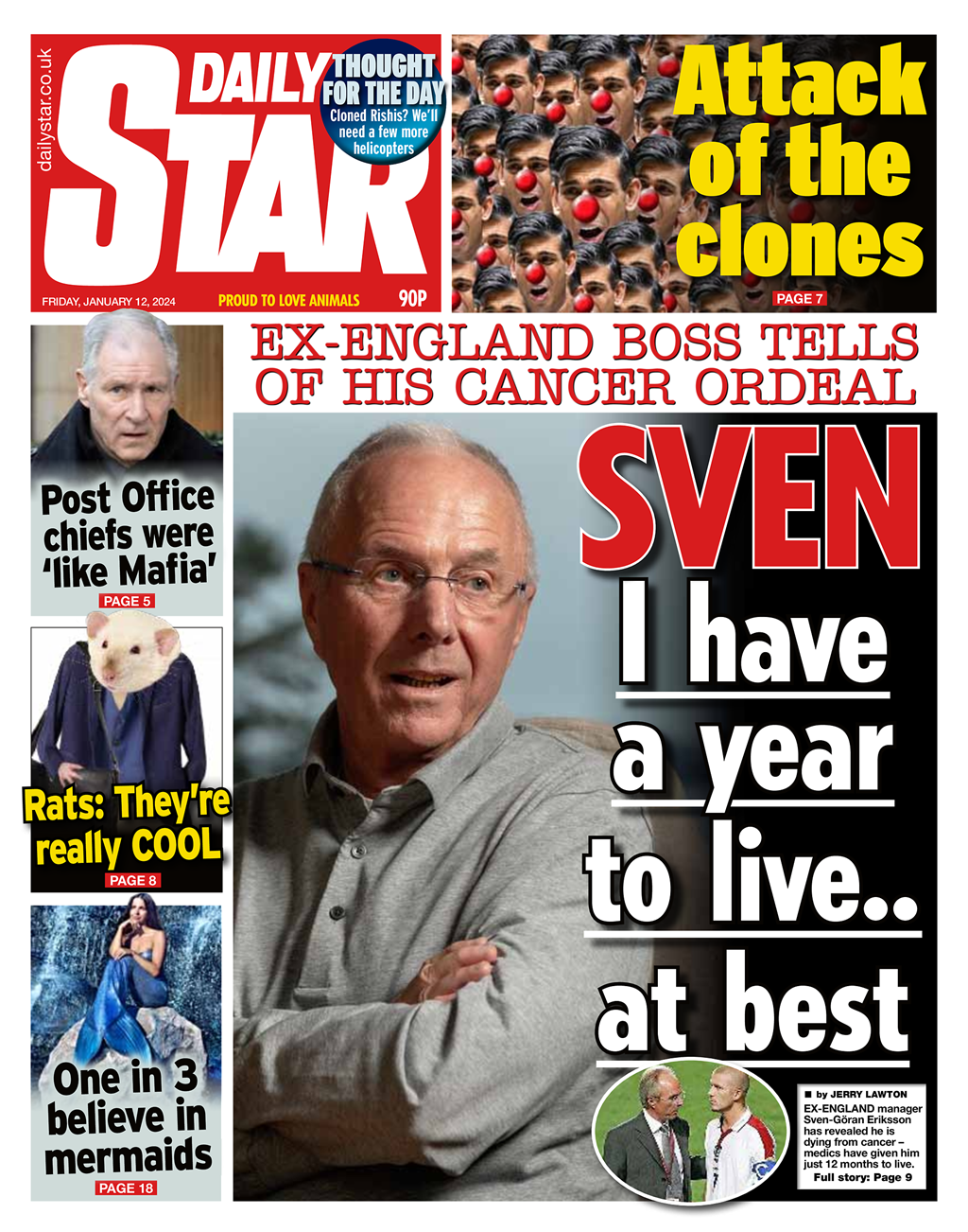 The Daily Star reports on Sven-Goran Eriksson’s claim of having only a year left to live.