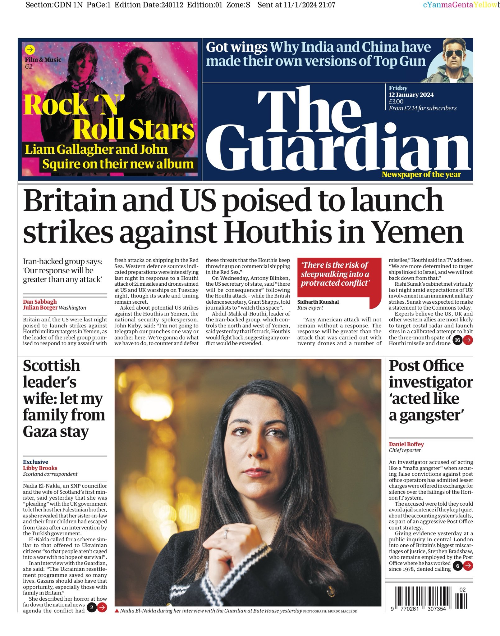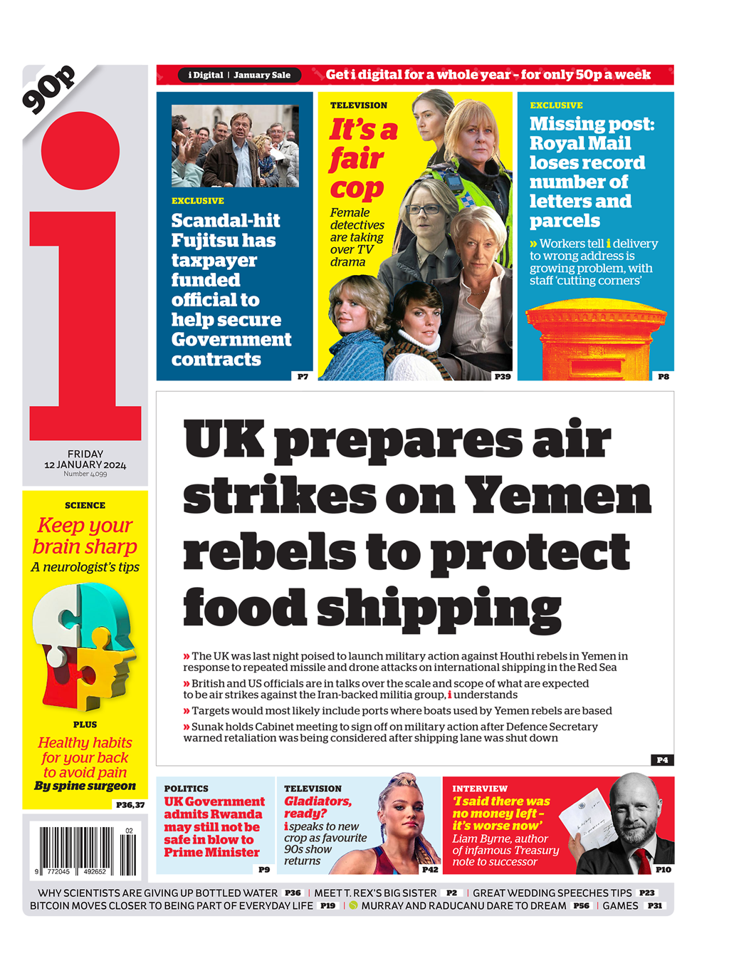 The Times reports Rishi Sunak’s approval of strikes on Yemen’s Houthi rebels to counter Iranian-backed aggression in the Red Sea.