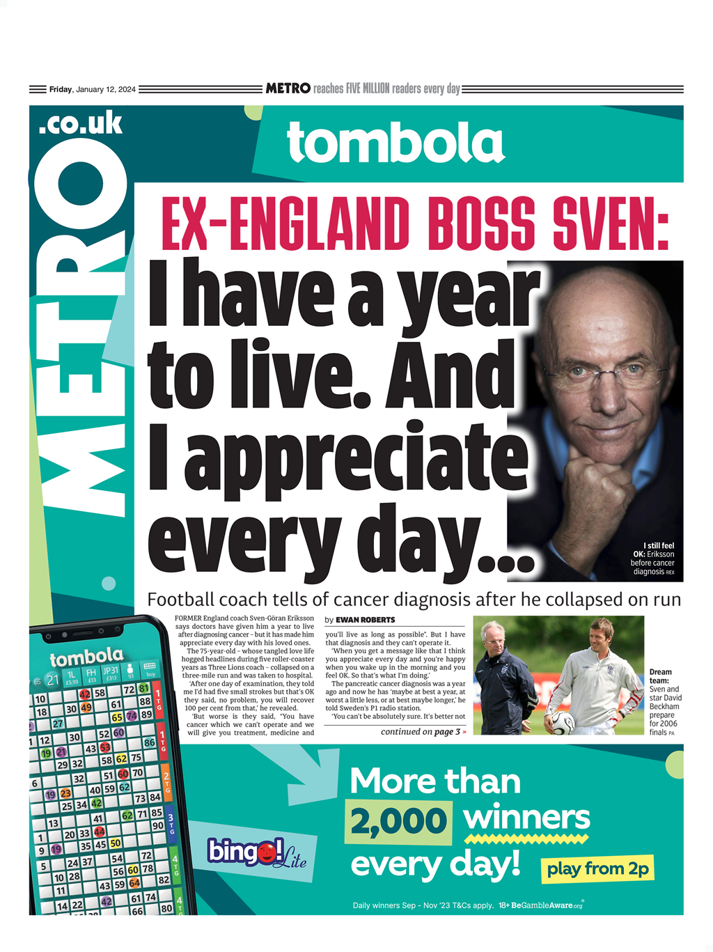 Ex-England boss, Sven-Goran Eriksson, reveals a year to live due to pancreatic cancer, says Metro.