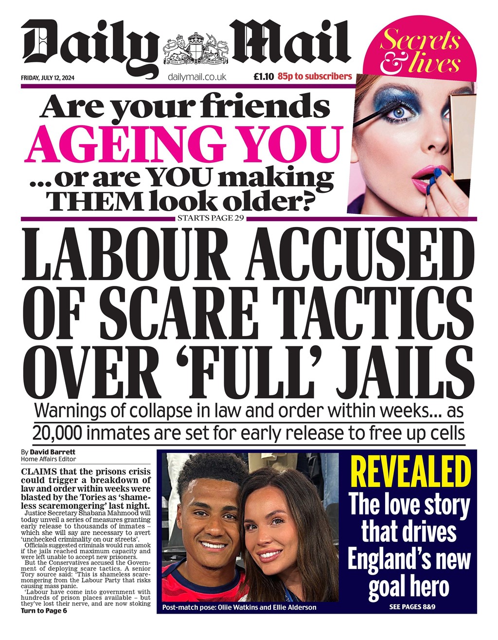 The Daily Mail highlights that some Tories dismiss claims of an imminent prisons crisis leading to law and order breakdown as “shameless scaremongering”.