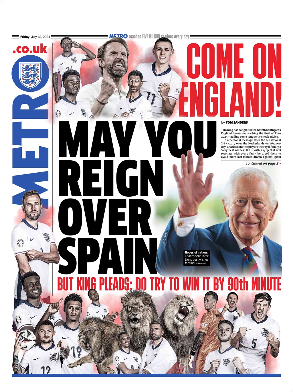 The King has praised Gareth Southgate’s England team for making it to the Euro 2024 final, with a humorous suggestion to secure victory before extra time, reports Metro.