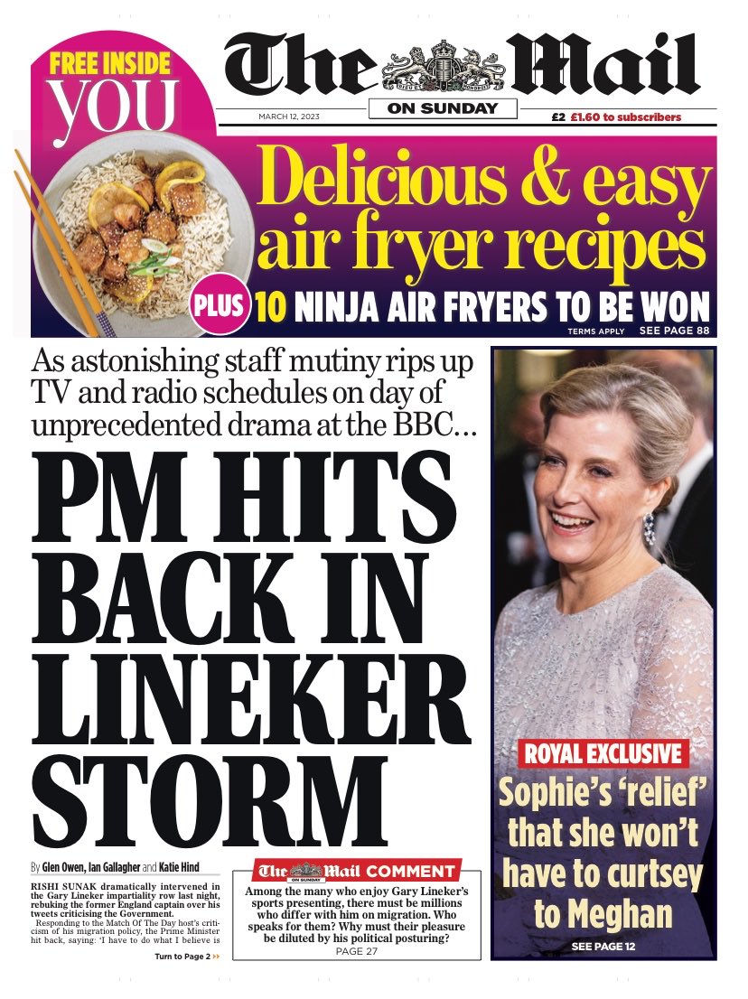 On Sunday Express’ front page, Prime Minister Rishi Sunak said he hoped the BBC-Lineker dispute could be resolved in a timely manner.