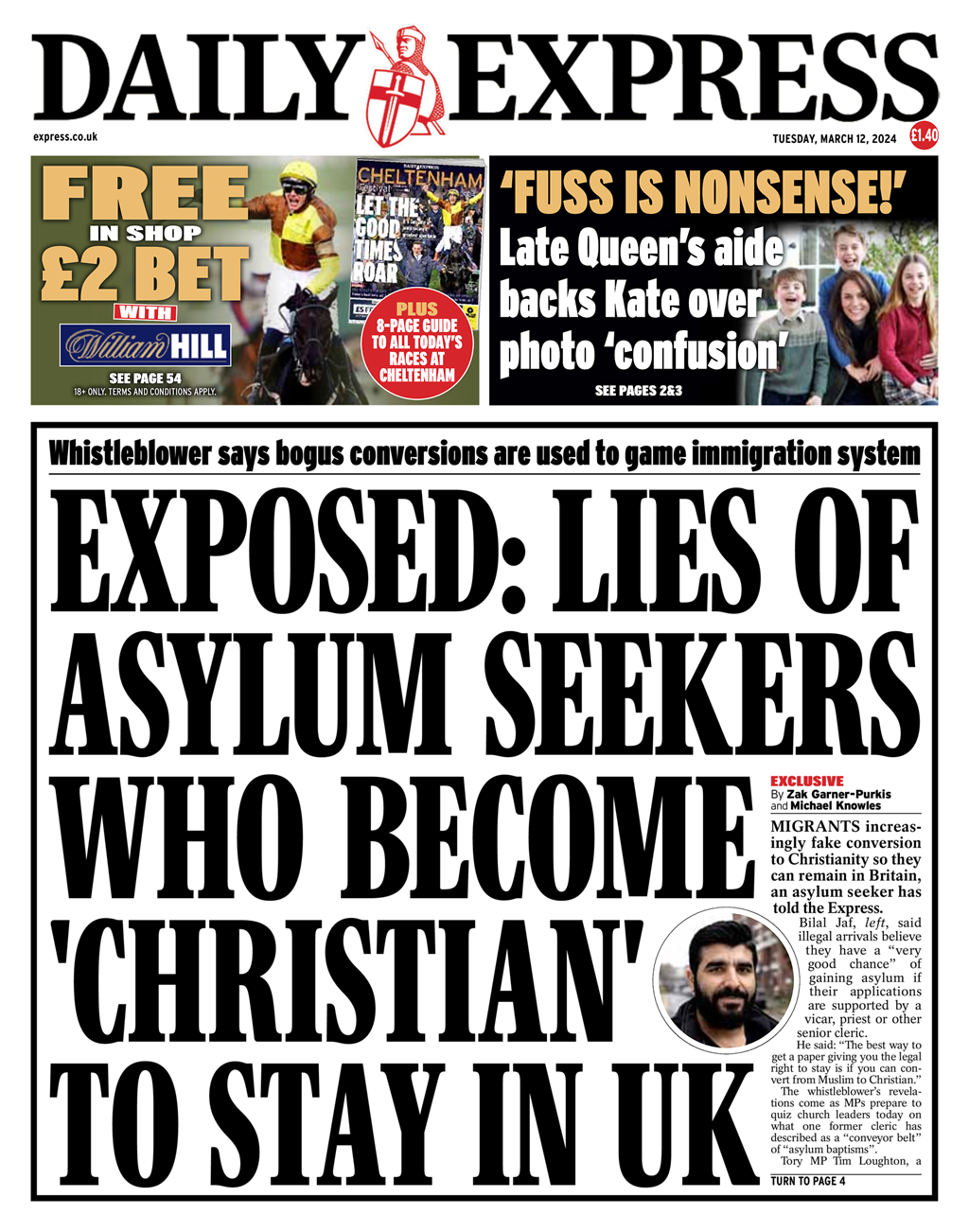 The Daily Express reports on the rising trend of migrants falsely claiming conversion to Christianity to secure their stay in Britain.