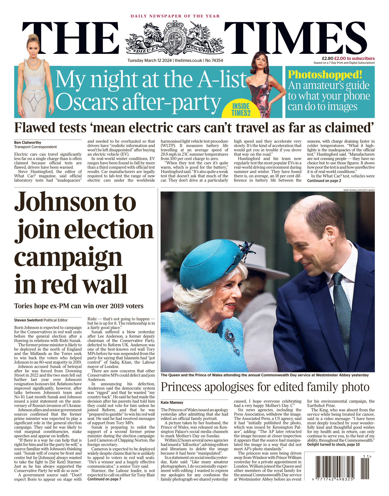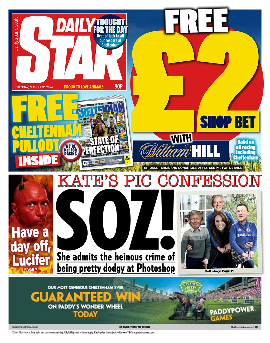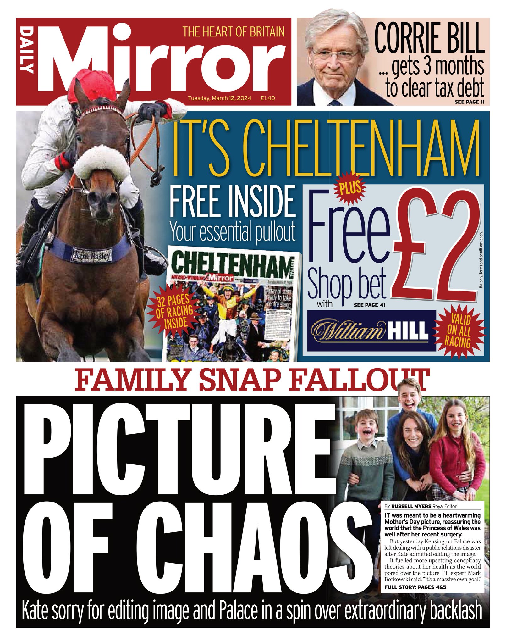 The Daily Mirror highlights the PR crisis at Kensington Palace following revelations of Princess of Wales’ edited Mother’s Day photo.