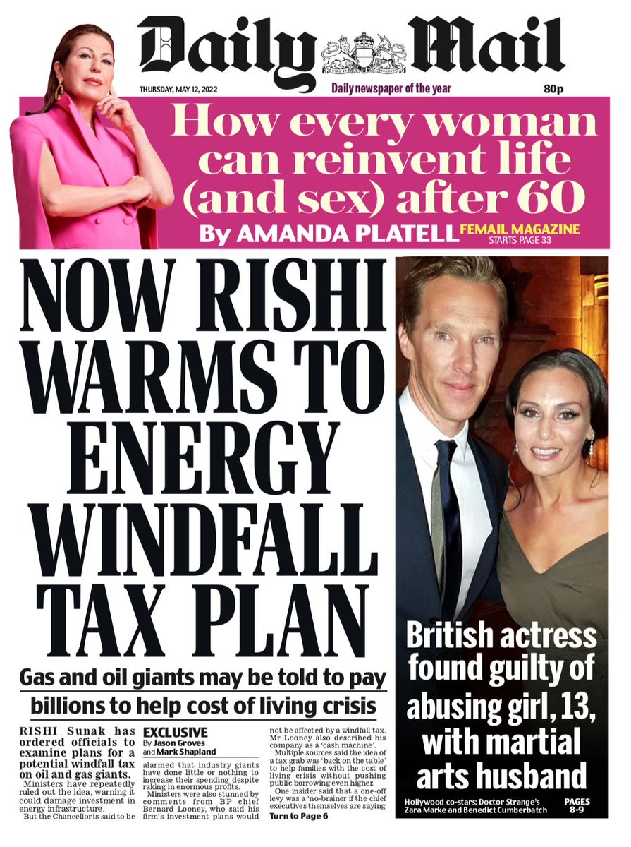 The Daily Mail reports that Rishi Sunak has ordered officials to examine plans for a windfall tax on oil and gas giants.
