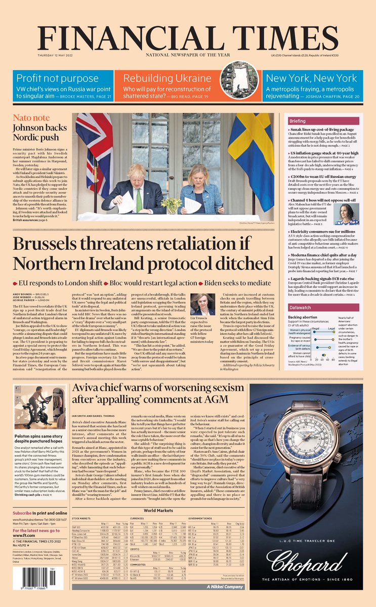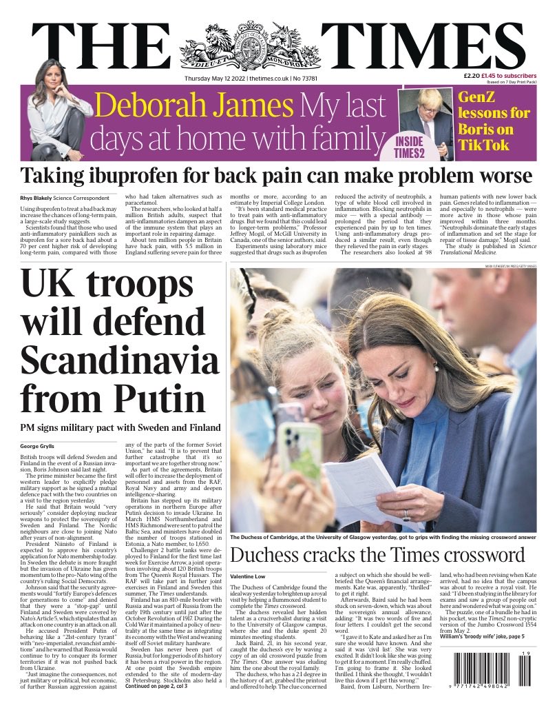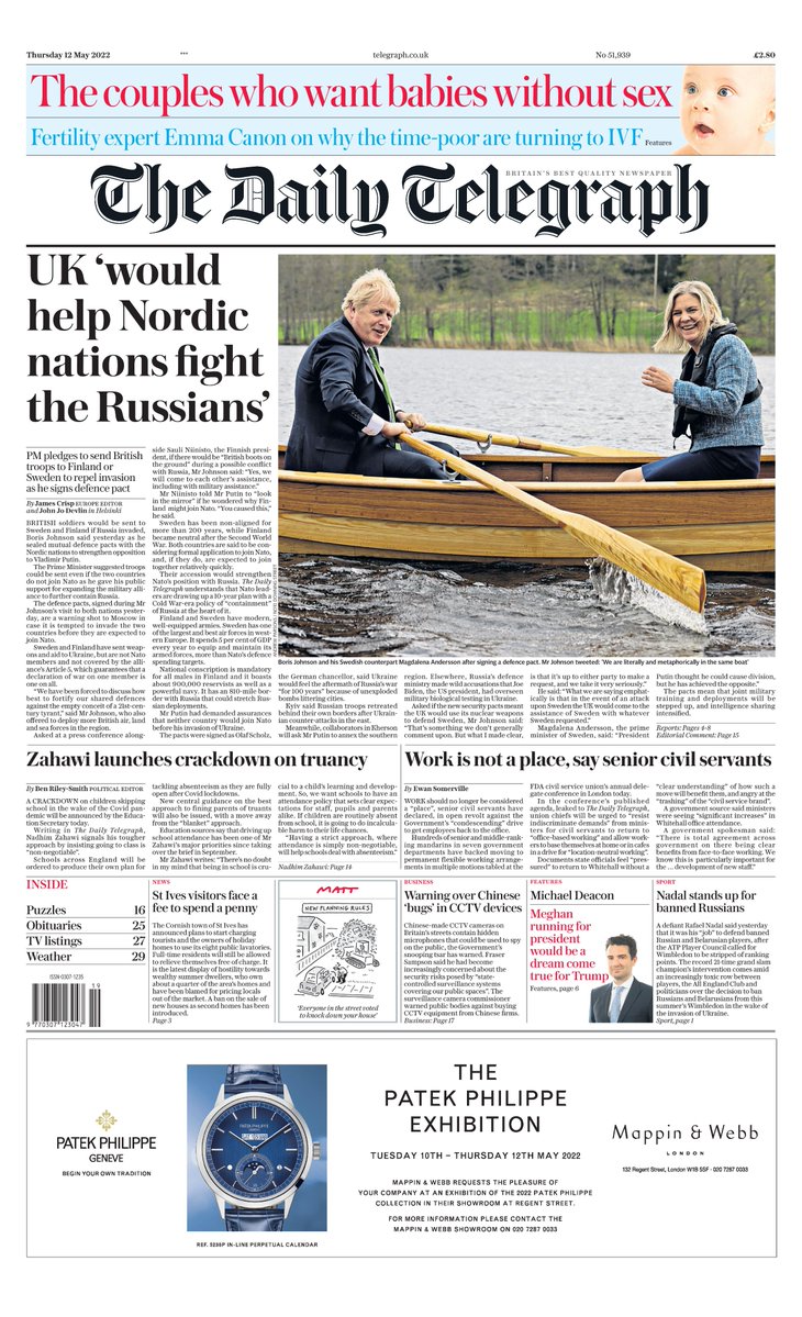 The Daily Telegraph reports on the prime minister’s visit to Scandinavia, during which he pledged military support for Finland and Sweden in the event of an invasion by Russia.