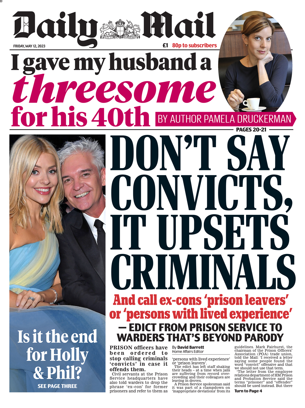 The Daily Mail reports on prison officers being ordered to stop calling criminals “convicts” to avoid offending them