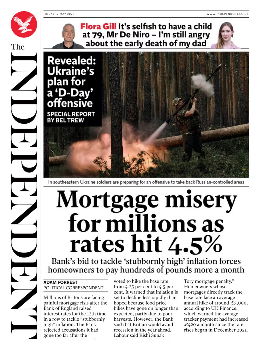 The Independent covers millions of Britons facing mortgage misery as the Bank of England raises interest rates for the 12th consecutive time.