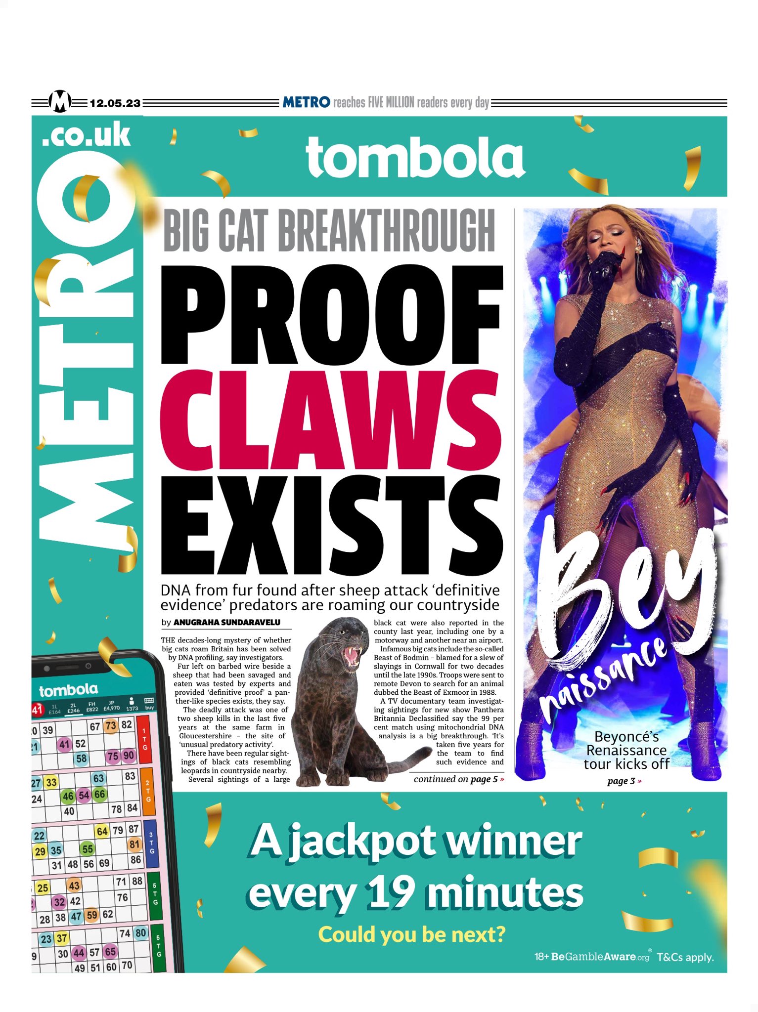 Metro’s top story is the “big cat breakthrough,” reporting on DNA profiling proving a “panther-like” species roaming the UK countryside.