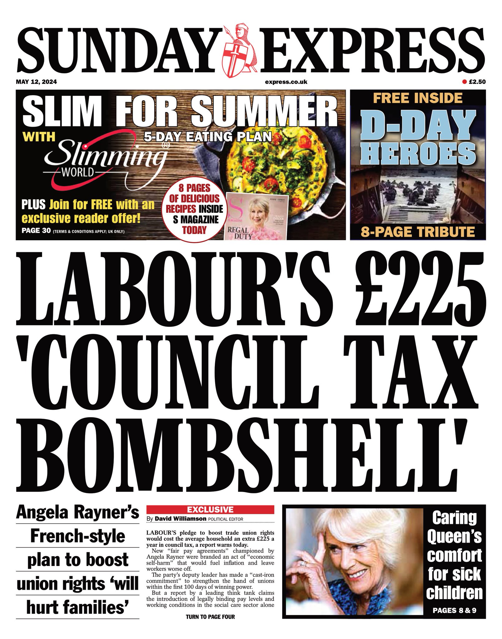 The Sunday Express highlights a think tank report indicating potential £225 annual increase in council tax due to Labour’s union law reforms.