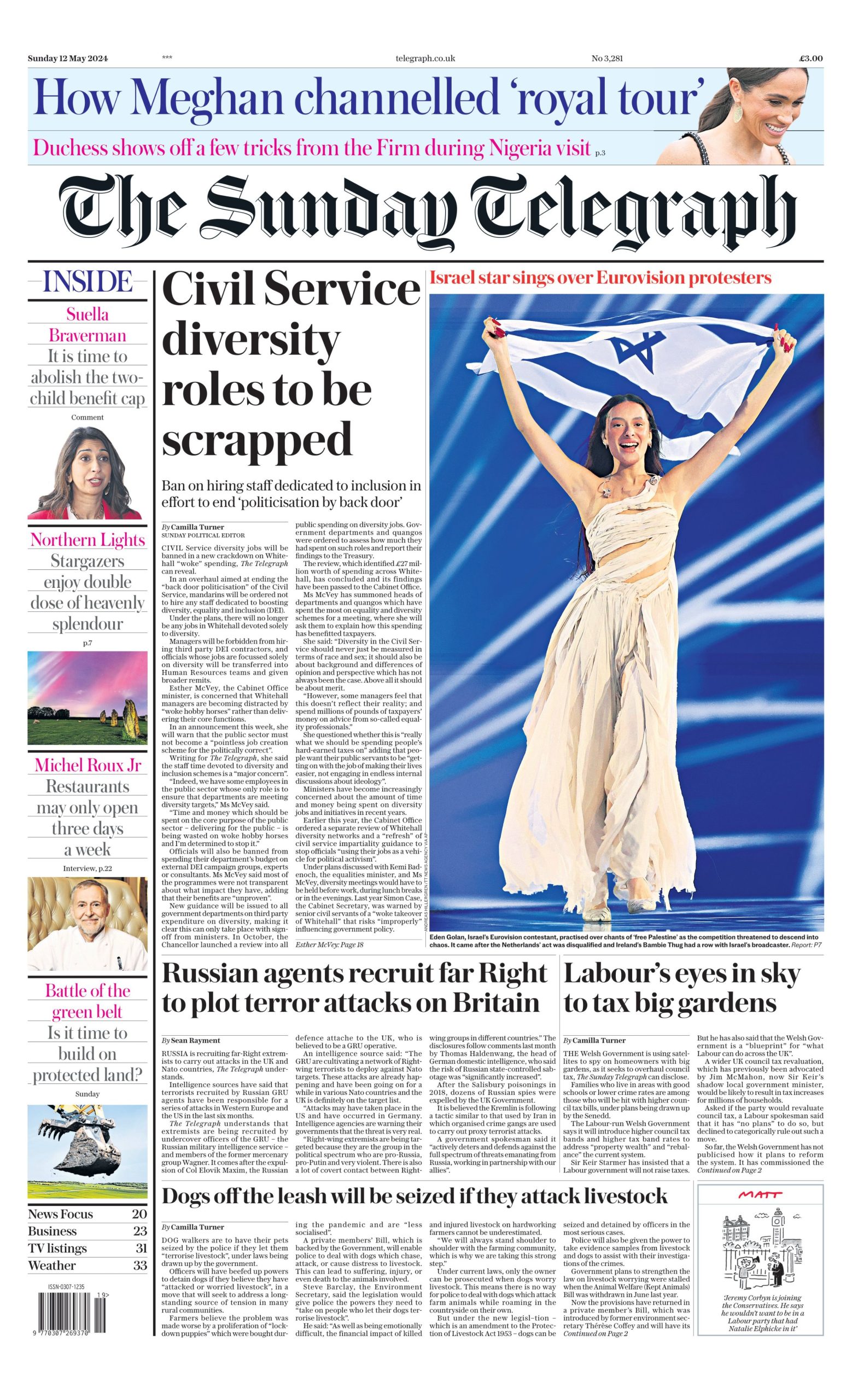 The Sunday Telegraph reports on the impending prohibition of civil service roles focused on diversity, equality, and inclusion due to a Whitehall spending clampdown.
