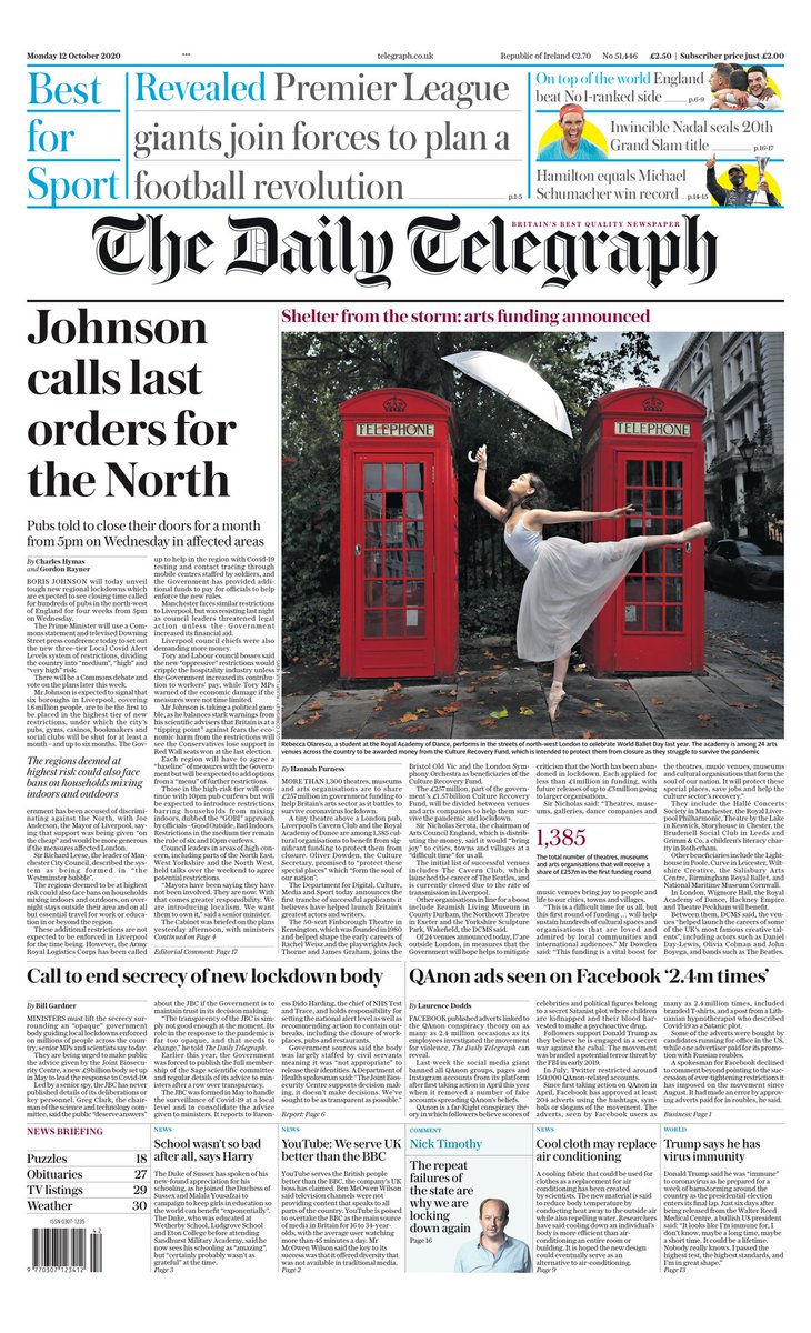 The Daily Telegraph says the new coronavirus restrictions in northern England are expected to start on Wednesday at 5pm and last for at least four weeks.