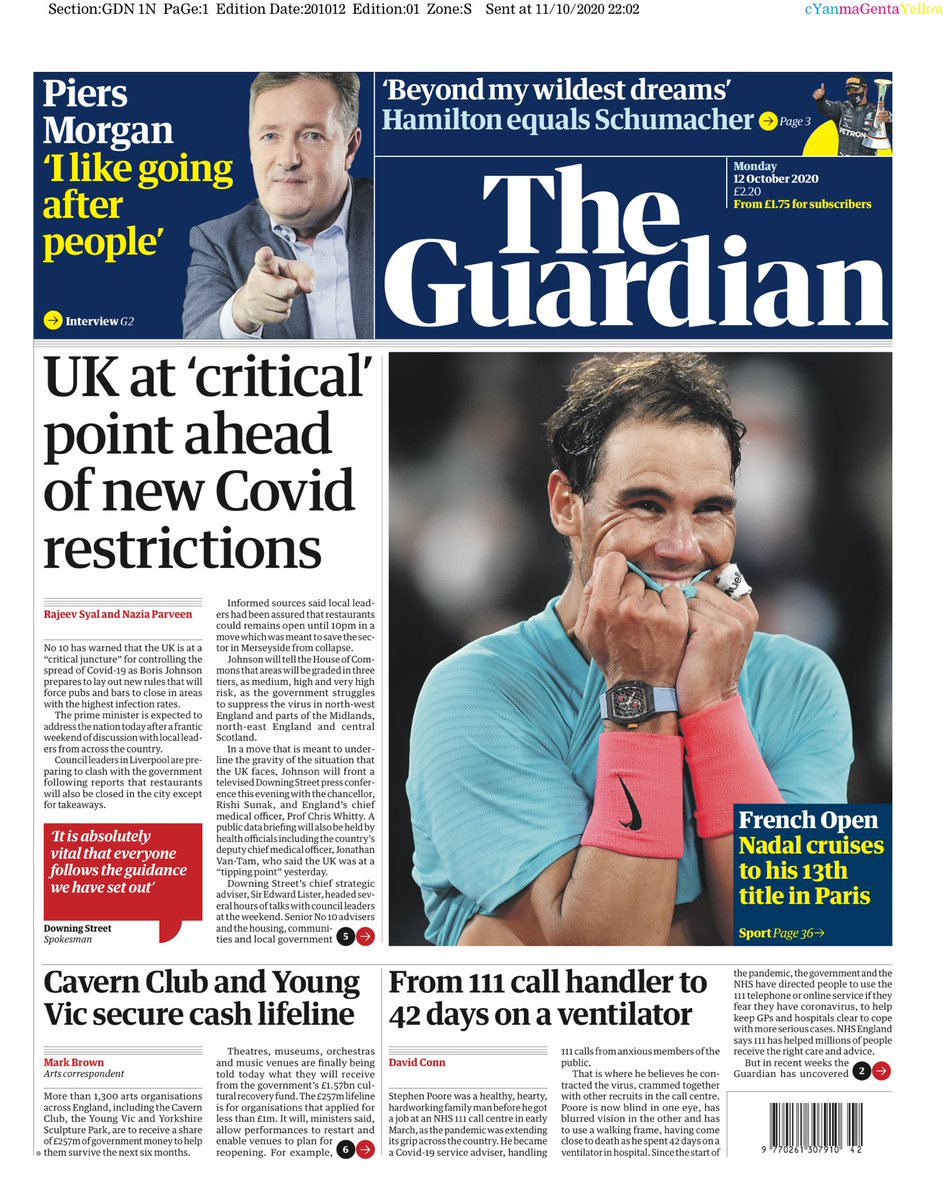 The Daily Mirror says 85% of people are worried about their jobs and the economy ahead of the expected announcement of the new coronavirus restrictions.