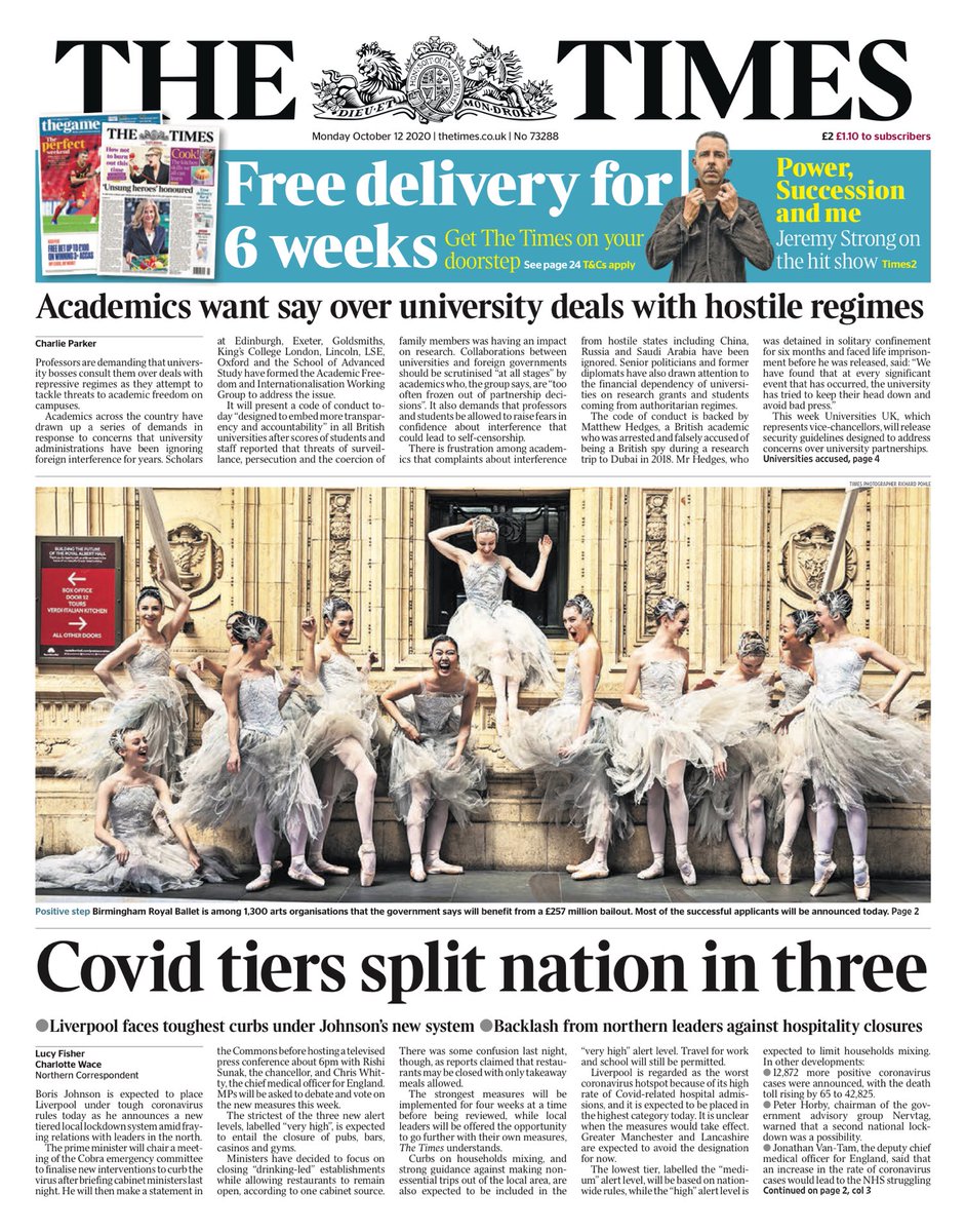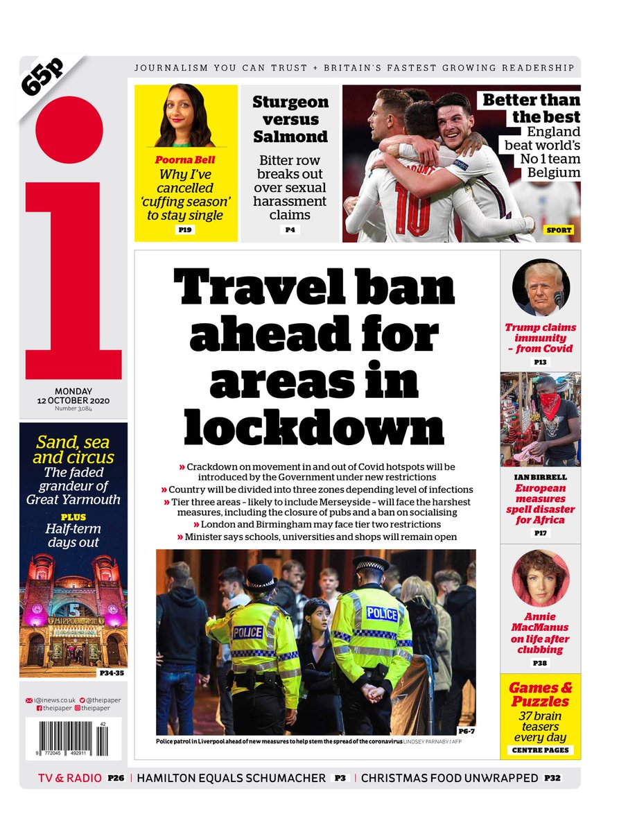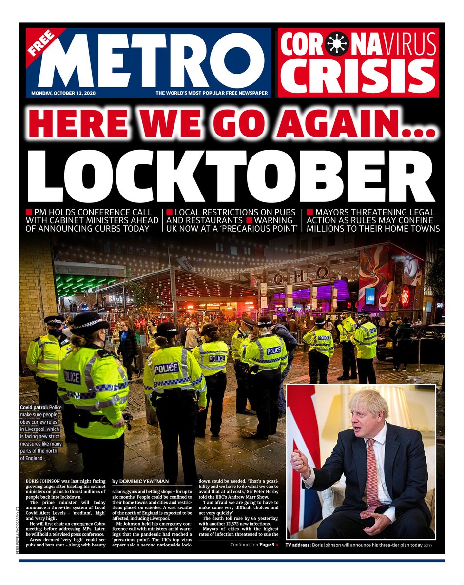 The Daily Express describes the expected three-tier system for England as a “drastic” effort “to save the NHS”.It says Boris Johnson will announce that Liverpool, Manchester and other northern cities will be ranked in the most high-risk category.