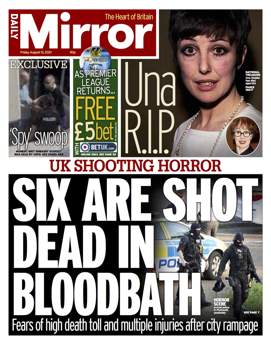 The Daily Mirror reports that six people have died after last night’s shooting in Plymouth.