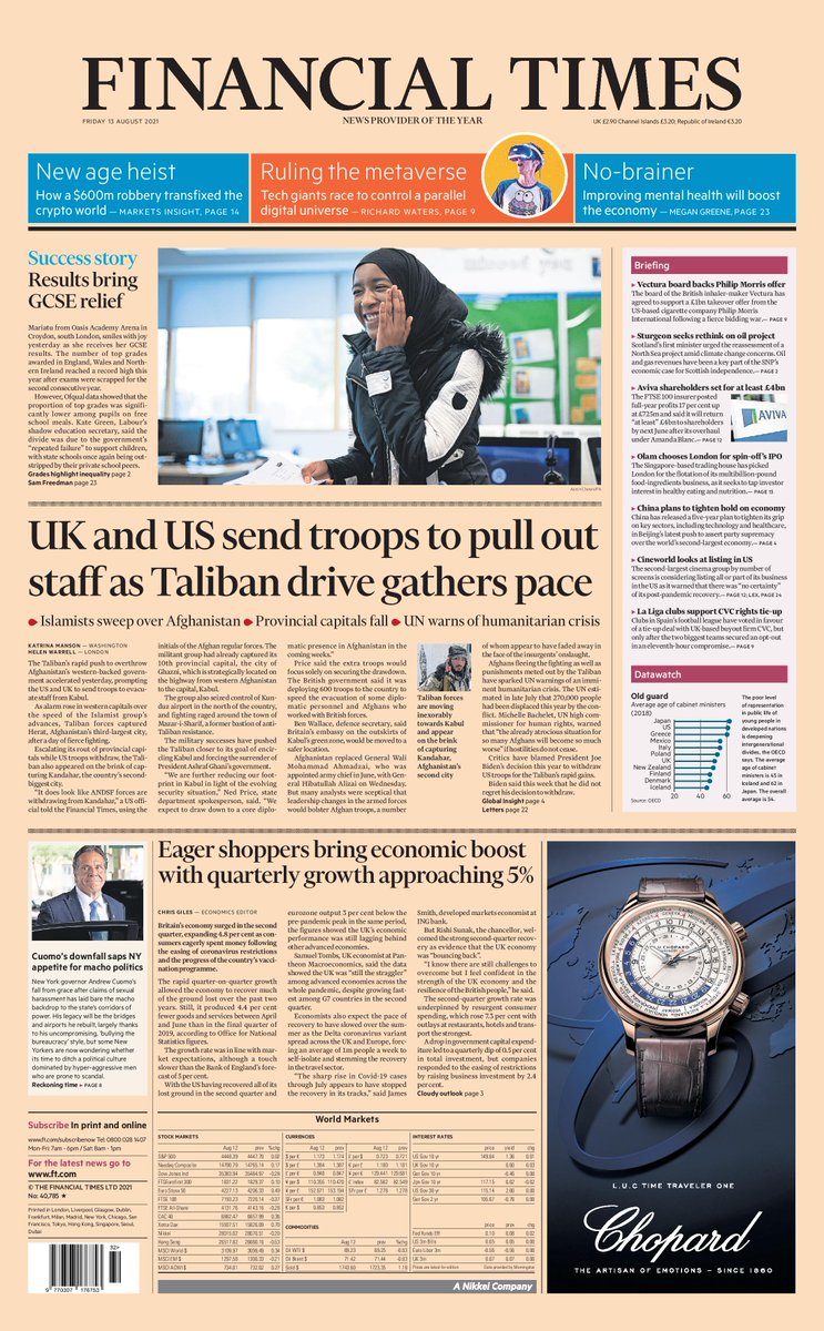 The Financial Times says the Taliban’s rapid push to overthrow Afghanistan’s Western-backed government accelerated yesterday – prompting the US and UK to take action as provincial capitals fall.