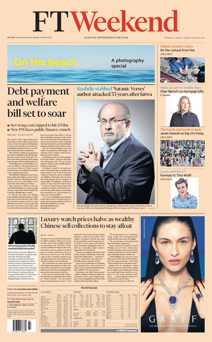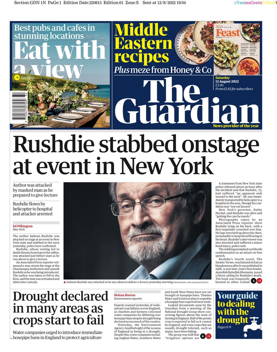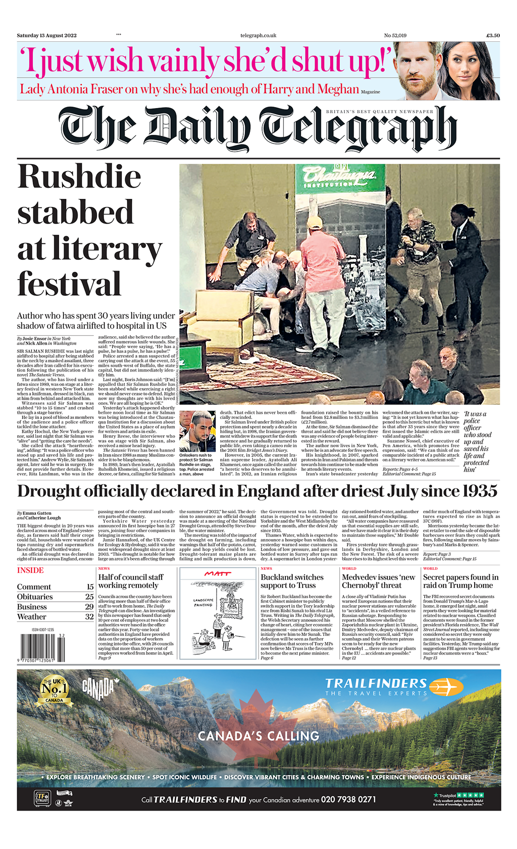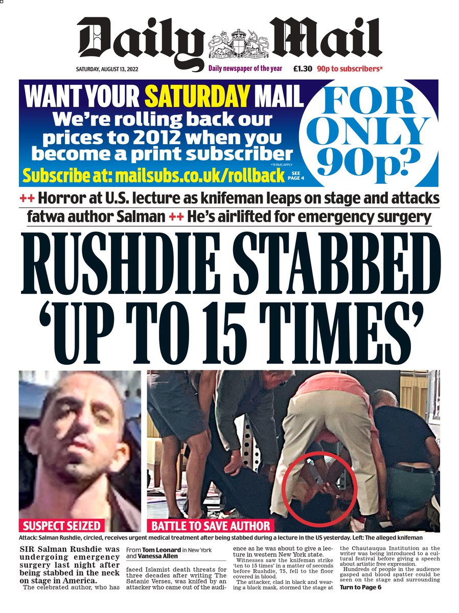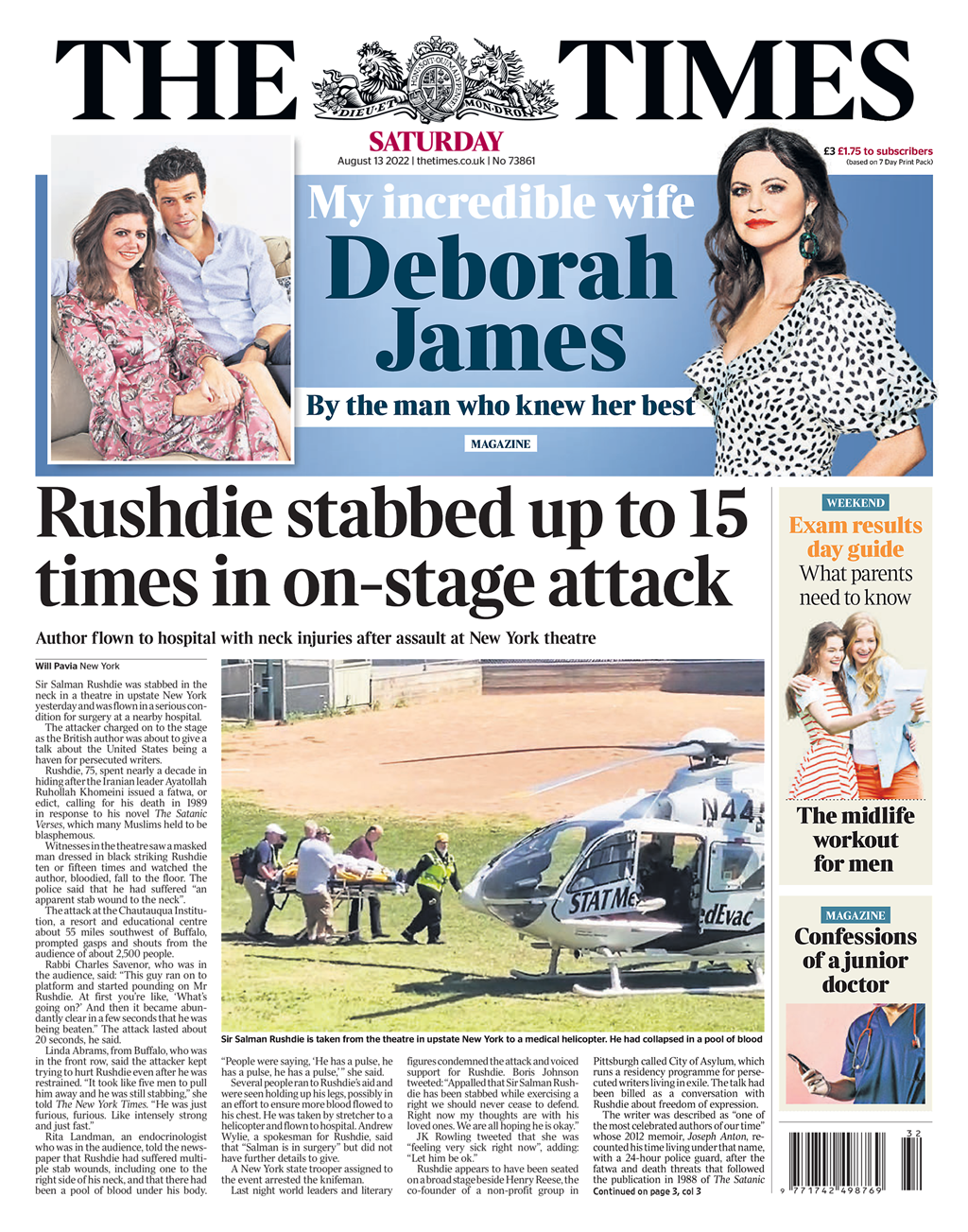 Salman Rushdie’s stabbing is the Times’ lead story.