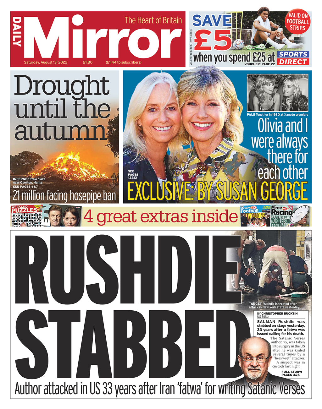 In its lead article, The Daily Mirror reports on the stabbing of Salman Rushdie.