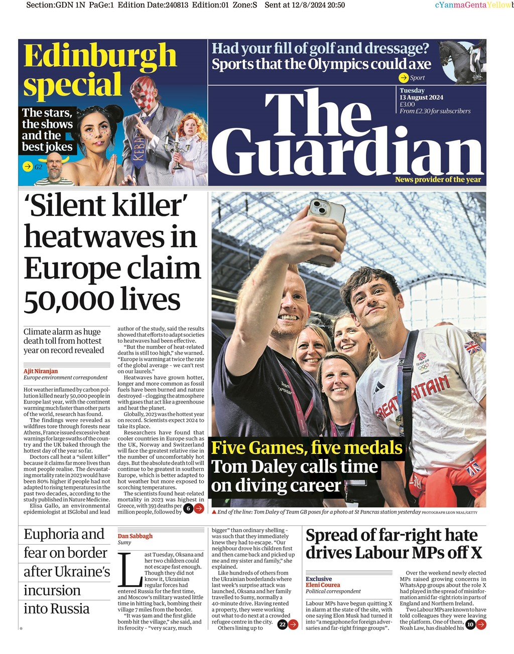 The Guardian reports that nearly 50,000 people in Europe died last year due to hot weather exacerbated by carbon pollution, with the continent warming significantly faster than other regions.